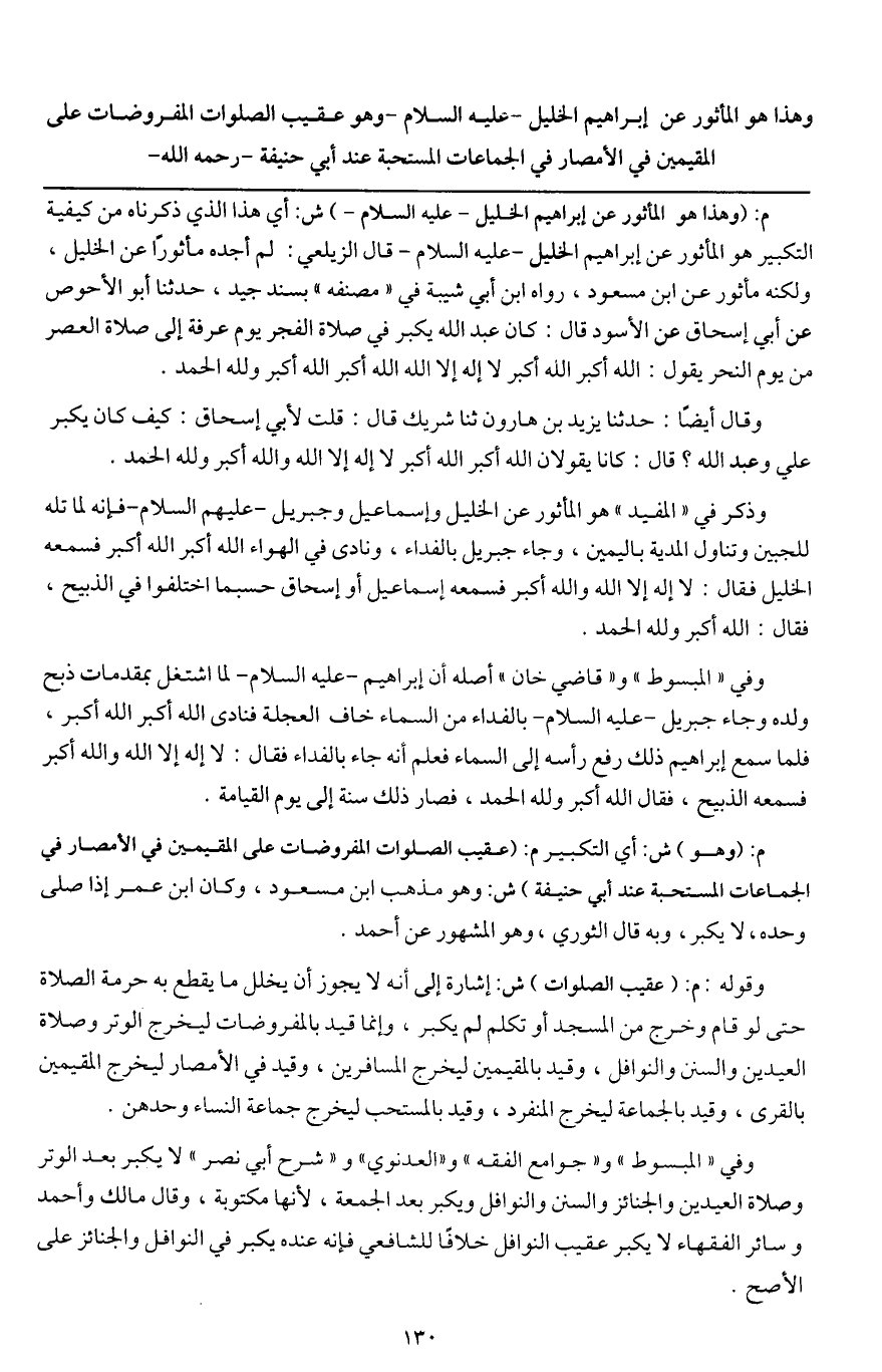 وهذا هو المأثور عن إبراهيم الخليل - عَلَيْهِ السَّلَامُ - وهو عقيب الصلوات المفروضات على المقيمين في الأمصار في الجماعات المستحبة عند أبي حنيفة - رَحِمَهُ اللَّهُ -