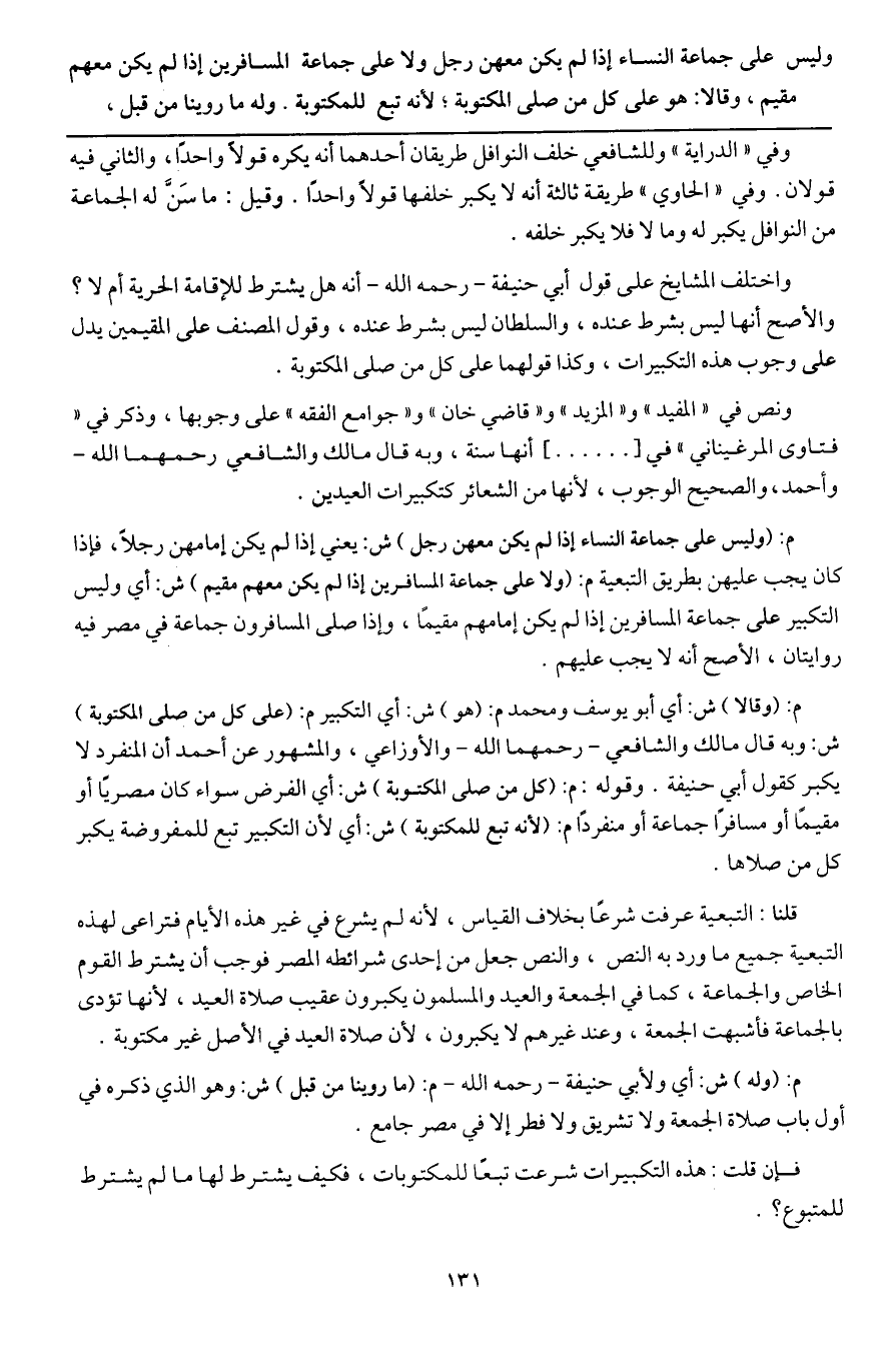 قلنا: التبعية عرفت شرعا بخلاف القياس، لأنه لم يشرع في غير هذه الأيام فتراعى لهذه التبعية جميع ما ورد به النص، والنص جعل من إحدى شرائطه المصر فوجب أن يشترط القوم الخاص والجماعة، كما في الجمعة والعيد والمسلمون يكبرون عقيب صلاة العيد، لأنها تؤدى بالجماعة فأشبهت الجمعة، وعند غيرهم لا يكبرون، لأن صلاة العيد في الأصل غير مكتوبة.