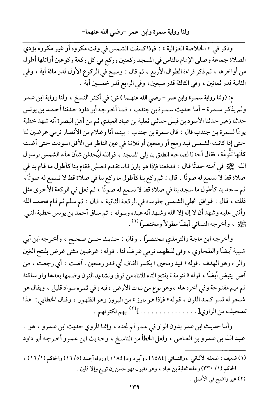 م: (ولنا رواية سمرة وابن عمر - رَضِيَ اللَّهُ عَنْهُمَا -) ، ش: في أكثر النسخ، ولنا رواية ابن عمر ولم يذكر سمرة - أما حديث سمرة بن جندب، فما أخرجه أبو داود حدثنا أحمد بن يونس حدثنا زهير حدثنا الأسود بن قيس حدثني ثعلبة بن عباد العبدي ثم من أهل البصرة أنه شهد خطبة يوما لسمرة بن جندب قال: «قال سمرة بن جندب: بينما أنا وغلام من الأنصار نرمي غرضين لنا حتى إذا كانت الشمس قيد رمح أو رمحين أو ثلاثة في عين الناظر من الأفق اسودت حتى آضت كأنها تَنُّومَة، فقال أحدنا لصاحبه انطلق بنا إلى المسجد، فوالله ليحدثن شأن هذه الشمس لرسول الله - صَلَّى اللَّهُ عَلَيْهِ وَسَلَّمَ - في أمته حدثا قال: فدفعنا فإذا هو بارز فاستقدم فصلى فقام بنا كأطول ما قام بنا في صلاة قط لا نسمع له صوتا. قال: ثم ركع بنا كأطول ما ركع بنا في صلاة قط لا نسمع له صوتا، ثم سجد بنا كأطول ما سجد بنا في صلاة قط لا نسمع له صوتا، ثم فعل في الركعة الأخرى مثل ذلك، قال: فوافق تجلي الشمس جلوسه في الركعة الثانية، قال: ثم سلم ثم قام فحمد الله وأثنى عليه وشهد أن لا إله إلا الله وشهد أنه عبده ورسوله» ثم ساق أحمد بن يونس خطبة النبي - صَلَّى اللَّهُ عَلَيْهِ وَسَلَّمَ -، وأخرجه النسائي أيضا مطولا ومختصرا.