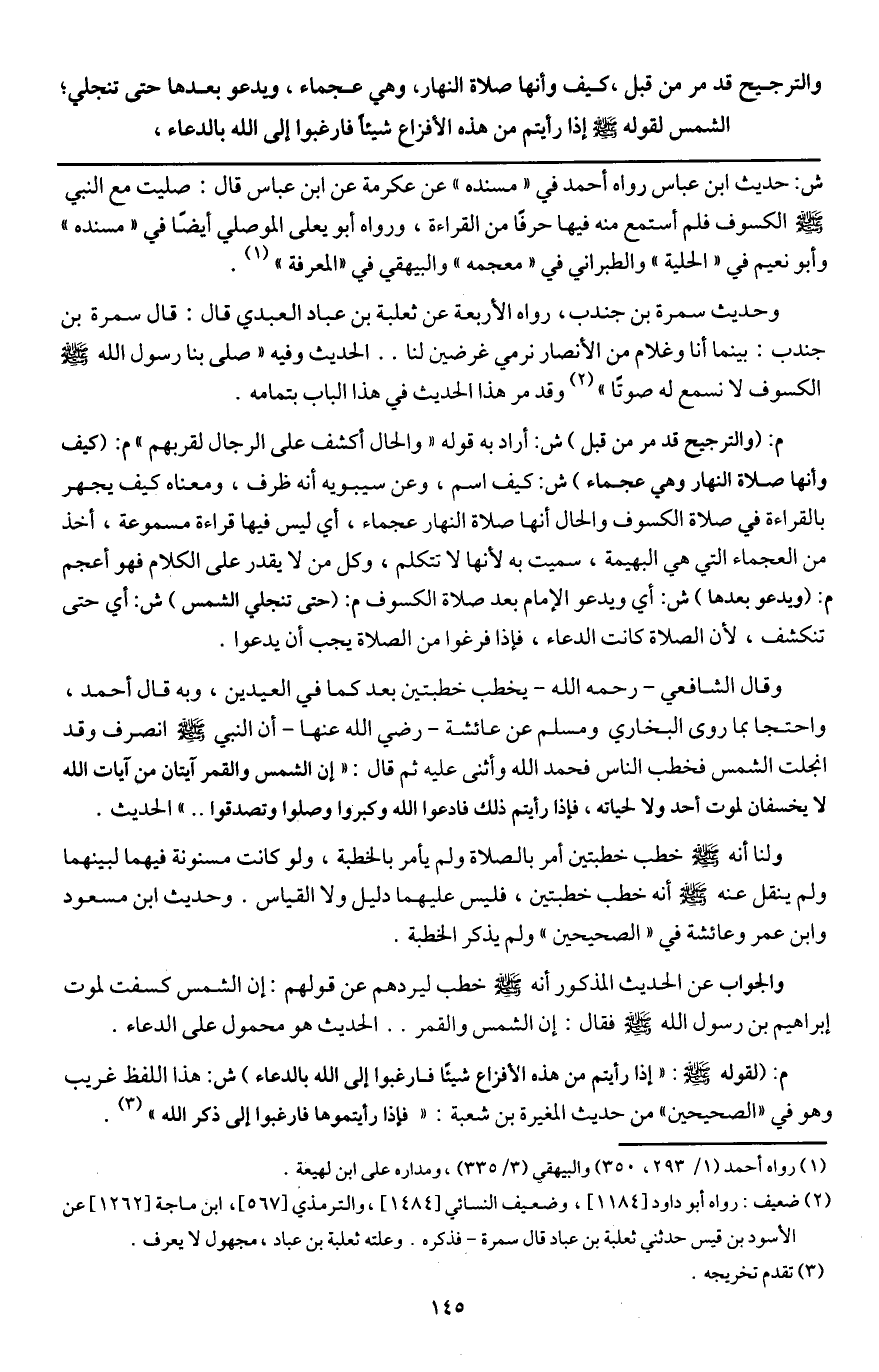 ـــــــــــــــــــــــــــــQش: حديث ابن عباس روه أحمد في " مسنده " عن عكرمة عن ابن عباس قال: «صليت مع النبي - صَلَّى اللَّهُ عَلَيْهِ وَسَلَّمَ - الكسوف فلم أستمع منه فيها حرفا من القراءة» ورواه أبو يعلى الموصلي أيضا في " مسنده " وأبو نعيم في " الحلية " والطبراني في " معجمه " والبيهقي في " المعرفة ".