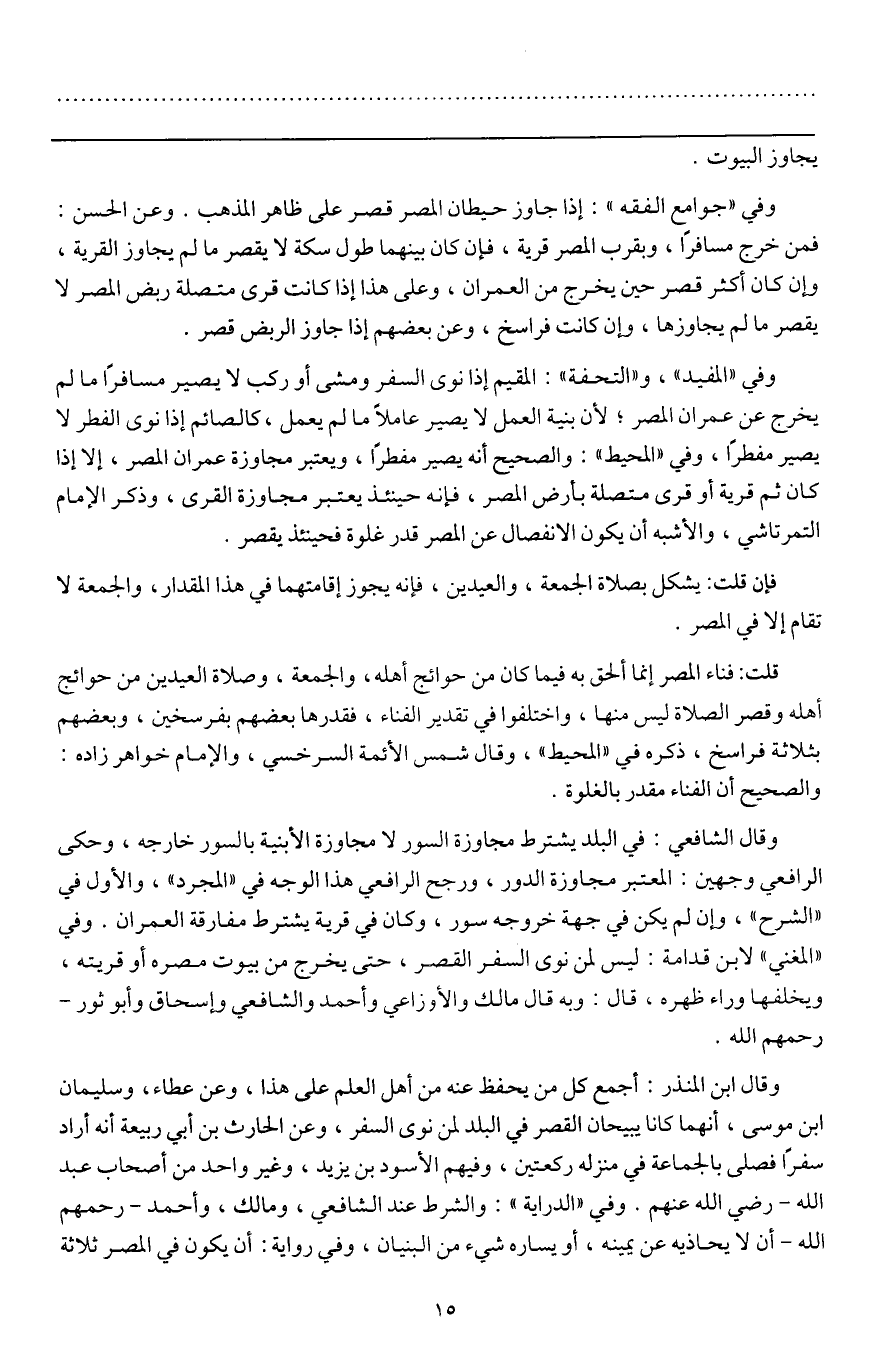 وقال الشافعي: في البلد يشترط مجاوزة السور لا مجاوزة الأبنية بالسور خارجه، وحكى الرافعي وجهين: المعتبر مجاوزة الدور، ورجح الرافعي هذا الوجه في " المجرد "، والأول في " الشرح "، وإن لم يكن في جهة خروجه سور، وكان في قرية يشترط مفارقة العمران. وفي " المغني " لابن قدامة: ليس لمن نوى السفر القصر، حتى يخرج من بيوت مصره أو قريته، ويخلفها وراء ظهره، قال: وبه قال مالك والأوزاعي وأحمد والشافعي وإسحاق وأبو ثور، - رَحِمَهُمُ اللَّهُ -.