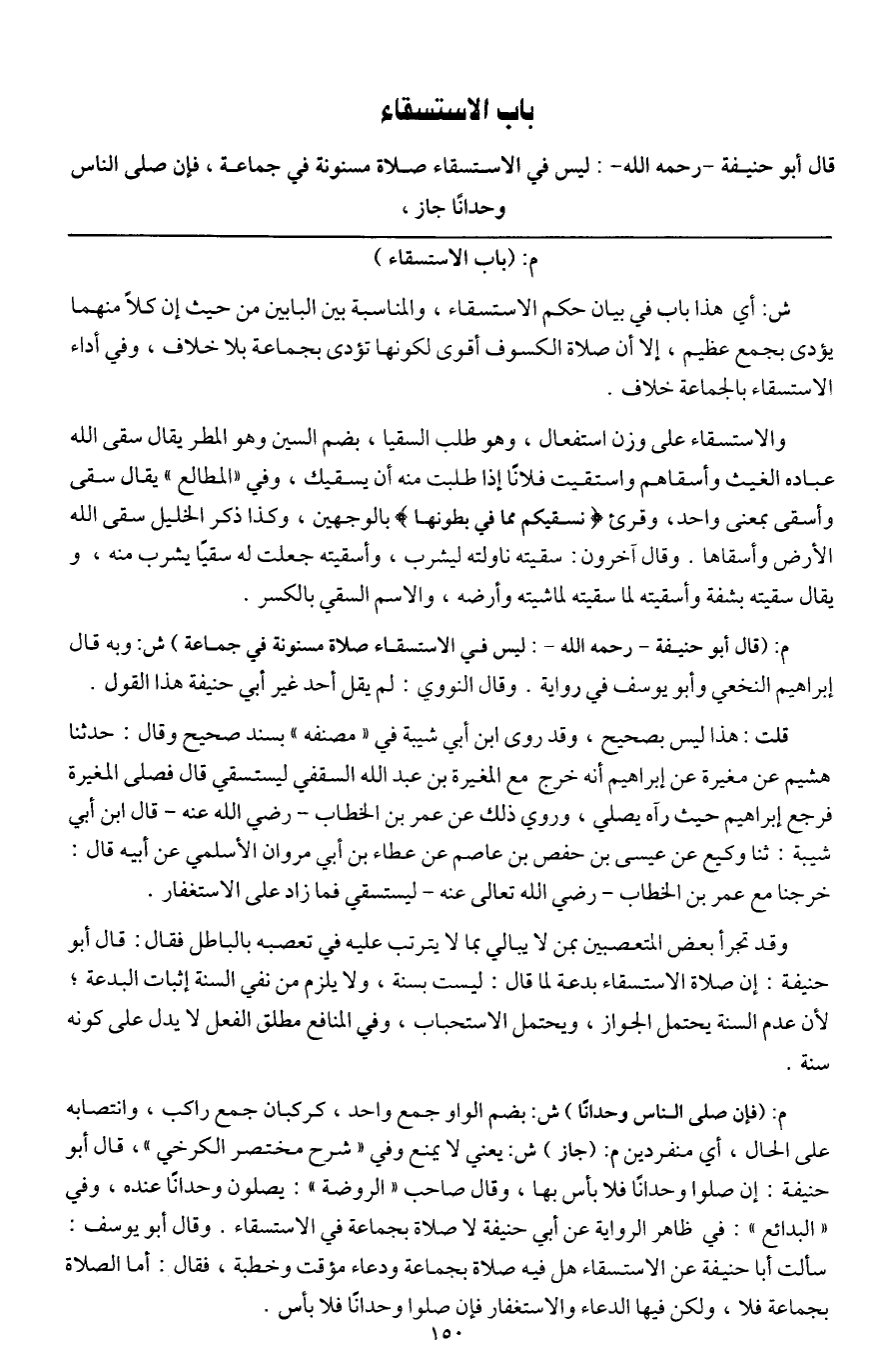 باب الاستسقاء قال أبو حنيفة - رَحِمَهُ اللَّهُ -: ليس في الاستسقاء صلاة مسنونة في جماعة، فإن صلى الناس وحدانا جاز،