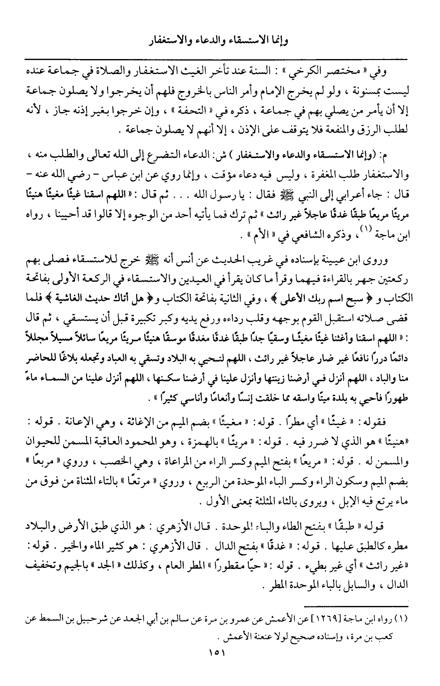 . ثم قال: " اللهم اسقنا غيثا مغيثا هنيئا مريئا مريعا طبقا غدقا عاجلا غير رائث "، ثم ترك فما يأتيه أحد من الوجوه إلا قالوا قد أحيينا» رواه ابن ماجه، وذكره الشافعي في " الأم ".