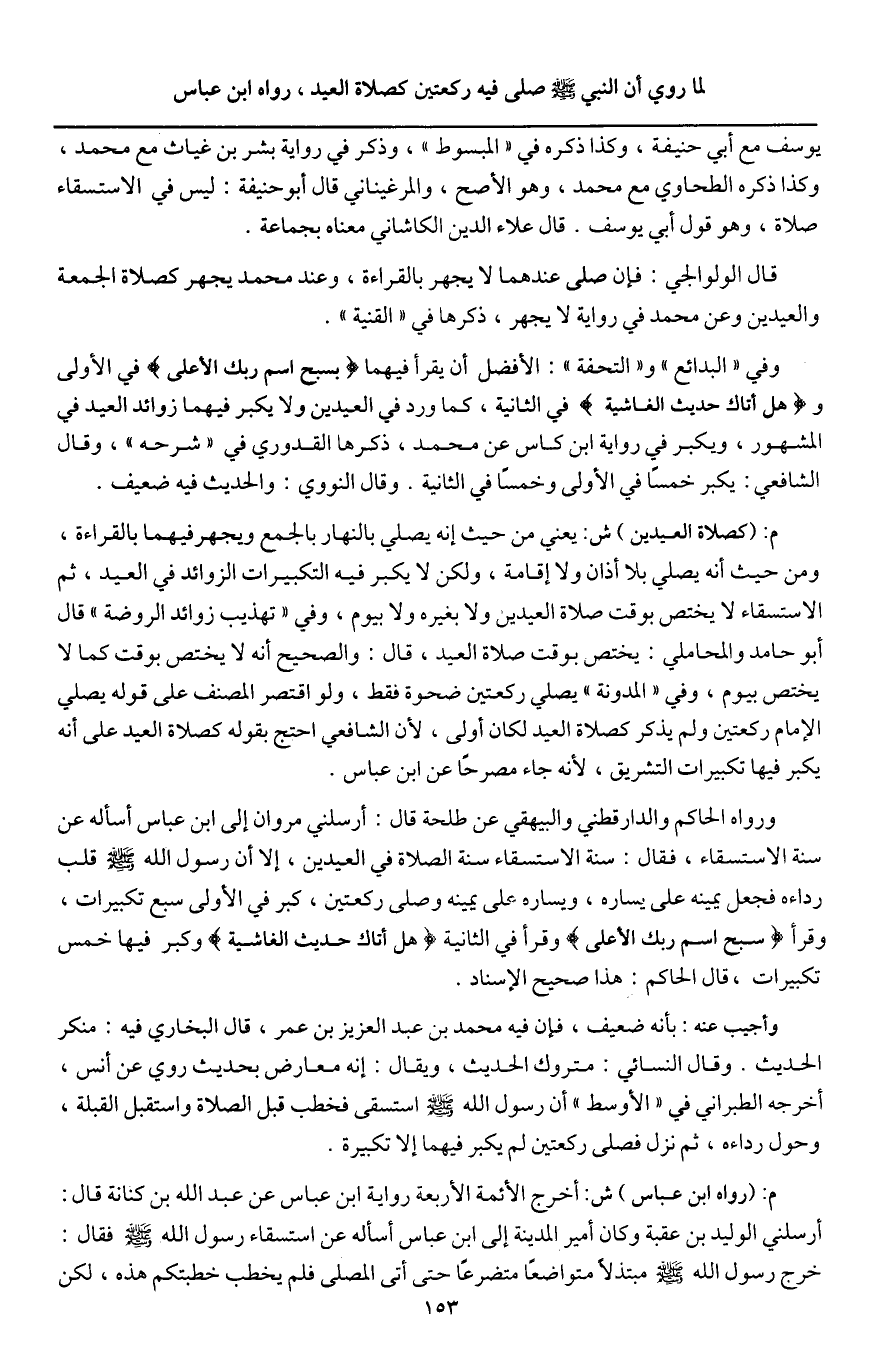 ورواه الحاكم والدارقطني والبيهقي «عن طلحة قال: أرسلني مروان إلى ابن عباس أسأله عن سنة الاستسقاء، فقال: سنة الاستسقاء سنة الصلاة في العيدين، إلا أن رسول الله - صَلَّى اللَّهُ عَلَيْهِ وَسَلَّمَ - قلب رداءه فجعل يمينه على يساره، ويساره على يمينه وصلى ركعتين، كبر في الأولى سبع تكبيرات، وقرأ {سَبِّحِ اسْمَ رَبِّكَ الْأَعْلَى} [الأعلى: 1] وقرأ في الثانية {هَلْ أَتَاكَ حَدِيثُ الْغَاشِيَةِ} [الغاشية: 1] وكبر فيها خمس تكبيرات» قال الحاكم: هذا صحيح الإسناد.