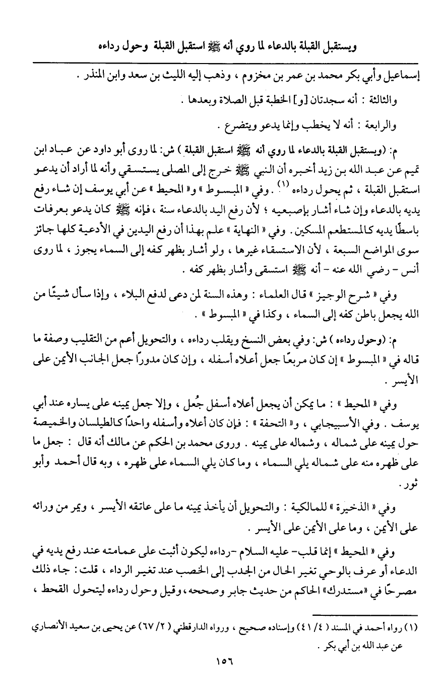 م: (وحول رداءه) ، ش: وفي بعض النسخ ويقلب رداءه، والتحويل أعم من التقليب وصفة ما قاله في " المبسوط " إن كان مربعا جعل أعلاه أسفله، وإن كان مدورا جعل الجانب الأيمن على الأيسر.