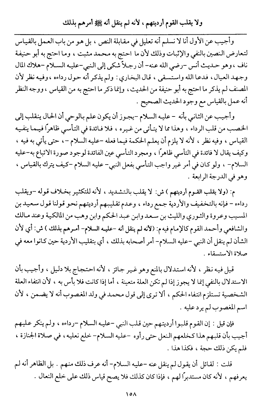 وأجيب عن الثاني بأنه - عَلَيْهِ السَّلَامُ - يجوز أن يكون علم بالوحي أن الحال ينقلب إلى الخصب من قلب الرداء، وهذا مما لا يتأتى من غيره، فلا فائدة في التأسي ظاهرا فيما ينفيه القياس، وفيه نظر، لأنه لا يلزم أن يعلم الحكمة فيما فعله - عَلَيْهِ السَّلَامُ -، حتى يأتي به فيه، وكيف يقال لا فائدة في التأسي ظاهرا، ومجرد التأسي عين الفائدة لوجود صورة الاتباع به - عَلَيْهِ السَّلَامُ -، ولو كان في أمر غير واجب التأسي بفعل النبي - عَلَيْهِ السَّلَامُ - كيف يترك بالقياس، وهو في الدرجة الرابعة.