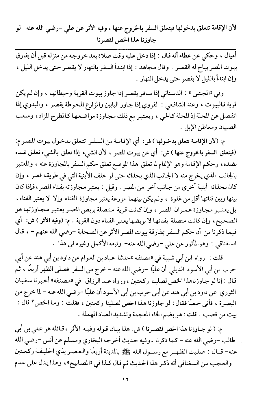لأن الإقامة تتعلق بدخولها فيتعلق السفر بالخروج عنها، وفيه الأثر عن علي - رَضِيَ اللَّهُ عَنْهُ - لو جاوزنا هذا الخص لقصرنا