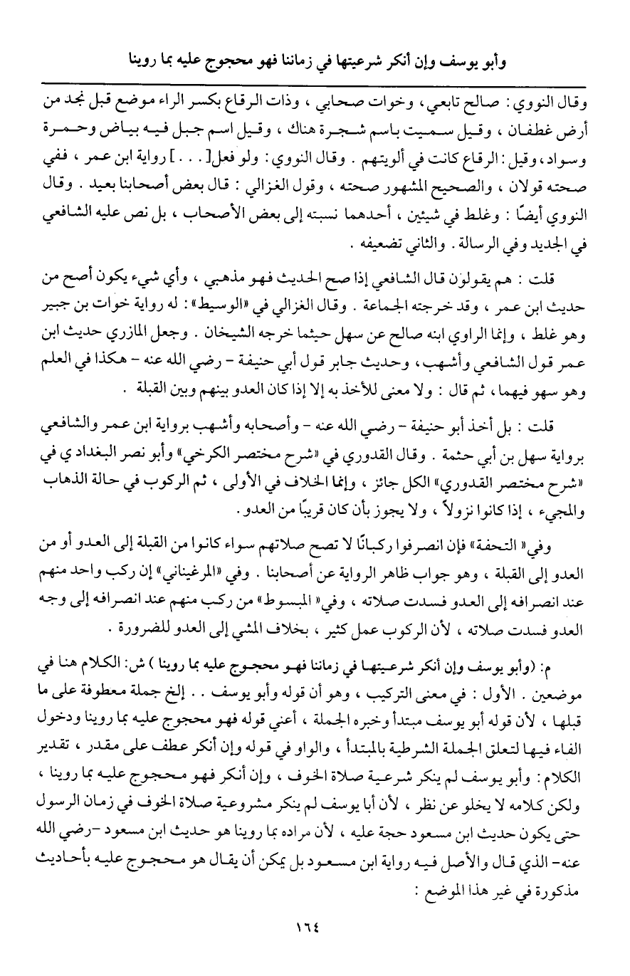 م: (وأبو يوسف وإن أنكر شرعيتها في زماننا فهو محجوج عليه بما روينا) ش: الكلام هنا في موضعين. الأول: في معنى التركيب، وهو أن قوله وأبو يوسف..إلخ جملة معطوفة على ما قبلها، لأن قوله أبو يوسف مبتدأ وخبره الجملة، أعني قوله فهو محجوج عليه بما روينا ودخول الفاء فيها لتعلق الجملة الشرطية بالمتبدأ، والواو في قوله وإن أنكر عطف على مقدر تقدير الكلام: وأبو يوسف لم ينكر شرعية صلاة الخوف وإن أنكر فهو محجوج عليه بما روينا، ولكن كلامه لا يخلو عن نظر، لأن أبا يوسف لم ينكر مشروعية صلاة الخوف في زمان الرسول حتى يكون حديث ابن مسعود حجة عليه، لأن مراده بما روينا هو حديث ابن مسعود - رَضِيَ اللَّهُ عَنْهُ - الذي قال والأصل فيه رواية ابن مسعود بل يمكن أن يقال هو محجوج عليه بأحاديث مذكورة في غير هذا الموضع: