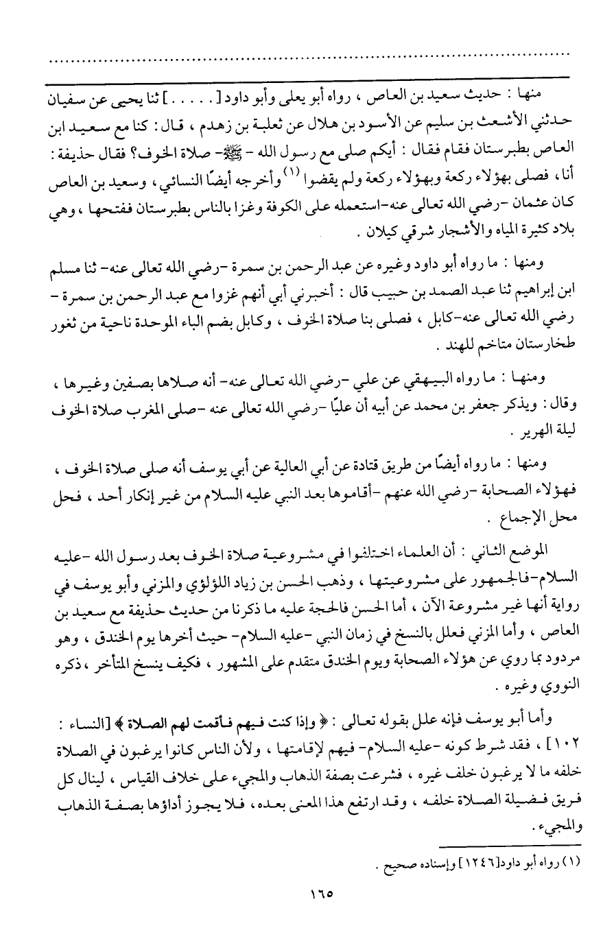 ..] ثنا يحيى عن سفيان حدثني الأشعث بن سليم عن الأسود بن هلال «عن ثعلبة بن زهدم، قال: كنا مع سعيد بن العاص بطبرستان فقام فقال: أيكم صلى مع رسول الله - صَلَّى اللَّهُ عَلَيْهِ وَسَلَّمَ - صلاة الخوف؟ فقال حذيفة: أنا، فصلى بهؤلاء ركعة وبهؤلاء ركعة ولم يقضوا وأخرجه أيضا النسائي،» وسعيد بن العاص كان عثمان - رَضِيَ اللَّهُ تَعَالَى عَنْهُ - استعمله على الكوفة وغزا بالناس بطبرستان ففتحها، وهي بلاد كثيرة المياه والأشجار شرقي كيلان.