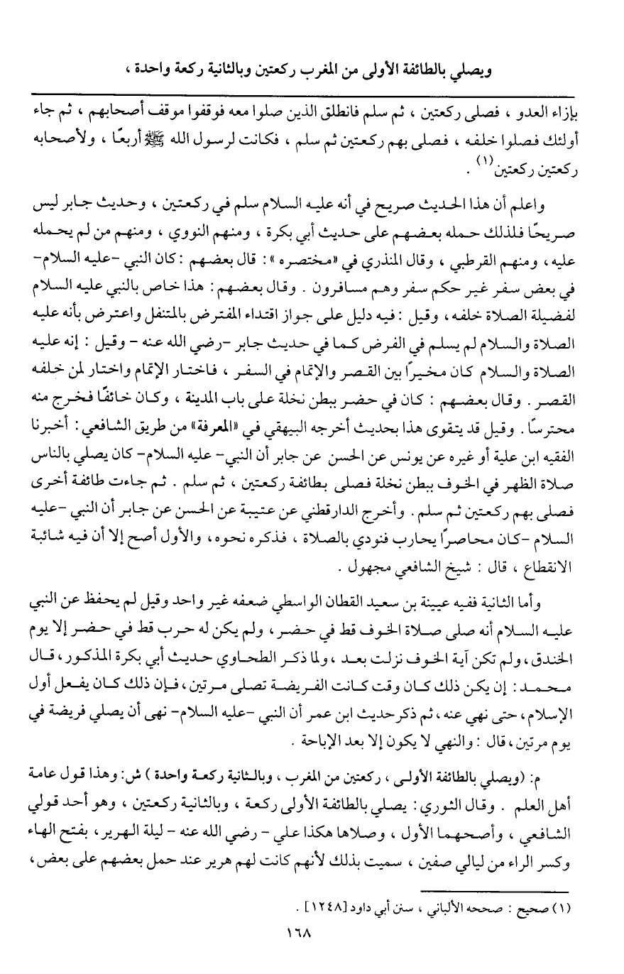 ويصلي بالطائفة الأولى من المغرب ركعتين وبالثانية ركعة واحدة،