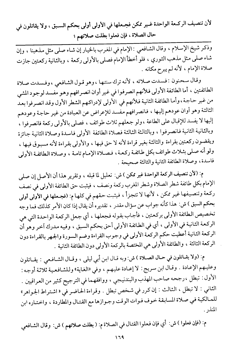 وقال سحنون: فسدت صلاته، لأنه ترك سنتها، وهو قول الشافعي، وفسدت صلاة الطائفتين، أما الطائفة الأولى فلأنهم انصرفوا في غير أوان انصرافهم وهو مفسد لوجود المشي من غير حاجة، وأما الطائفة الثانية فلأنهم في الأولى لإدراكهم الشطر الأول وقد انصرفوا بعد الثالثة وهو أوان عودهم إليها، فانصرافهم مفسد للإعراض عن العبادة من غير حاجة وعودهم إليها لا يفسد للإقبال على الطاعة، ولو جعلهم ثلاث طوائف، فصلى بالأولى ركعة فانصرفوا، وبالثانية الثانية فانصرفوا، وبالثالثة الثالثة فصلاة الطائفة الأولى فاسدة وصلاة الثانية جائزة ويقضون ركعتين بقراءة والثالثة بغير قراءة لأنه لا حق فيها، والأولى بقراءة لأنه مسبوق فيها، ولو أنه صلى بثلاث طوائف بكل طائفة ركعة، فصلاة الإمام تامة، وصلاة الطائفة الأولى فاسدة، وصلاة الطائفة الثانية والثالثة صحيحة.