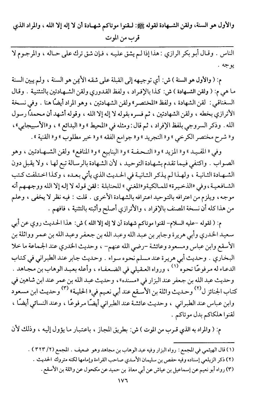 وفي " المفيد " و " المزيد " و " التحفة " و " الينابيع " و " المنافع " ولقن الشهادتين، وهو الصواب. واكتفي فيما تقدم بشهادة التوحيد، لأن الشهادة بالرسالة تبع لها، ولا يقبل دون الشهادة الثانية، ولهذا لم يذكر الثانية في الحديث الذي يأتي بعده، وكذا اختلفت كتب الشافعية، وفي " الذخيرة " للمالكية و " المغني " للحنابلة: لقن قوله لا إله إلا الله ووجههم أنه موجه، ويلزم من اعترافه بالتوحيد اعترافه بالشهادة الأخرى. قلت: فيه نظر لا يخفى، وعلم من هذا كله أن نسخة المصنف بالإفراد، والأترازي أصلح وأثبته بالتثنية، فافهم.
