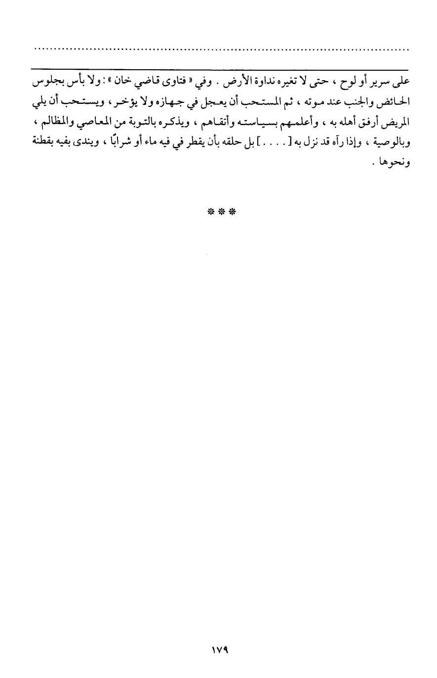 ـــــــــــــــــــــــــــــQعلى سرير أو لوح، حتى لا تغيره نداوة الأرض. وفي " فتاوى قاضي خان ": ولا بأس بجلوس الحائض والجنب عند موته، ثم المستحب أن يعجل في جهازه ولا يؤخر، ويستحب أن يلي المريض أرفق أهله به، وأعلمهم بسياسته وأتقاهم، ويذكره بالتوبة من المعاصي والمظالم، وبالوصية، وإذا رآه قد نزل به [....] بل حلقه بأن يقطر في فيه ماء أو شرابا، ويندى بفيه بقطنة ونحوها.