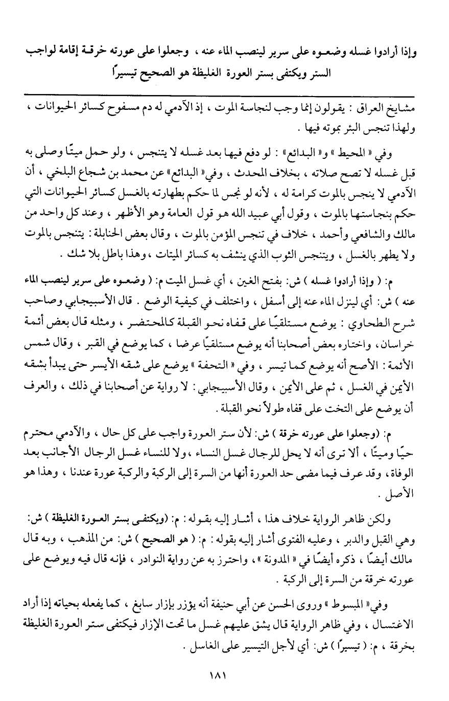 وإذا أرادوا غسله وضعوه على سرير لينصب الماء عنه، وجعلوا على عورته خرقة إقامة لواجب الستر ويكتفى بستر العورة الغليظة هو الصحيح تيسيرا