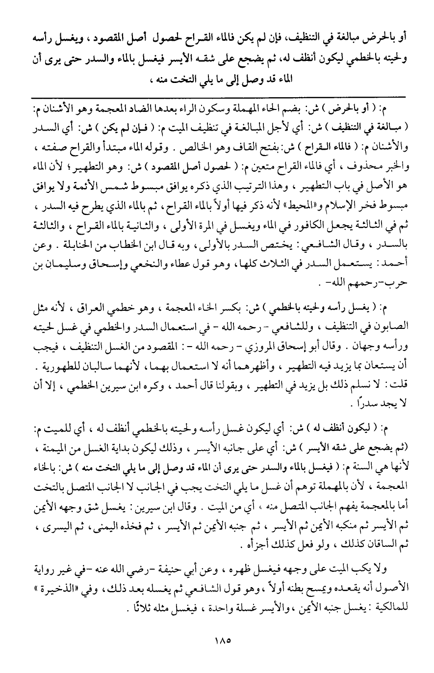 أو بالحرض مبالغة في التنظيف، فإن لم يكن فالماء القراح لحصول أصل المقصود، ويغسل رأسه ولحيته بالخطمي ليكون أنظف له، ثم يضجع على شقه الأيسر فيغسل بالماء والسدر حتى يرى أن الماء قد وصل إلى ما يلي التخت منه،
