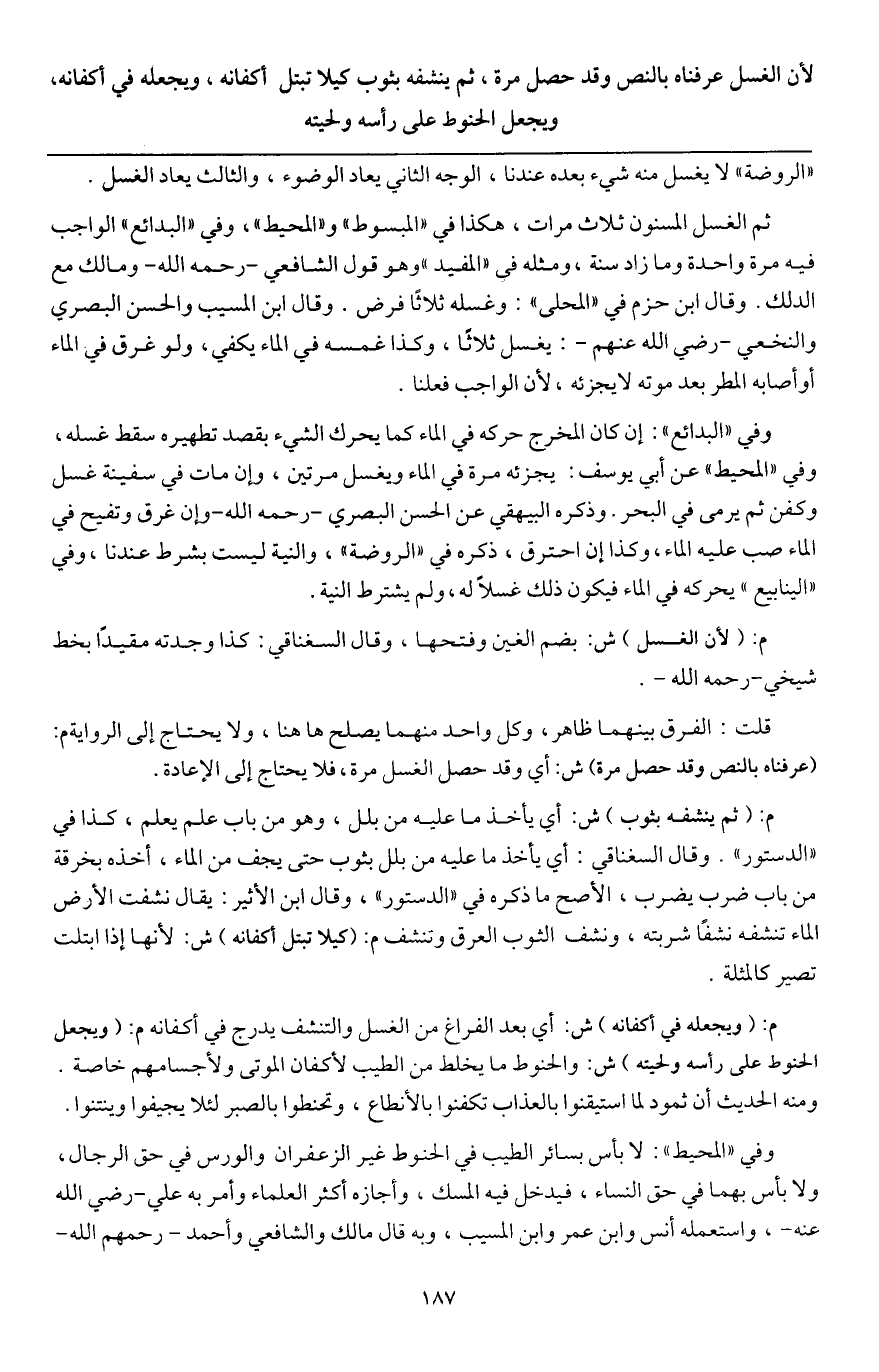 ثم الغسل المسنون ثلاث مرات. هكذا في " المبسوط " و " المحيط "، وفي " البدائع " الواجب فيه مرة واحدة وما زاد سنة، ومثله في " المفيد " وهو قول الشافعي - رَحِمَهُ اللَّهُ - ومالك مع الدلك. وقال ابن حزم في " المحلى ": وغسله ثلاثا فرض. وقال ابن المسيب والحسن البصري والنخعي - رَضِيَ اللَّهُ عَنْهُمْ -: يغسل ثلاثا، وكذا غمسه في الماء يكفي، ولو غرق في الماء أو أصابه المطر بعد موته لا يجزئه، لأن الواجب فعلنا.