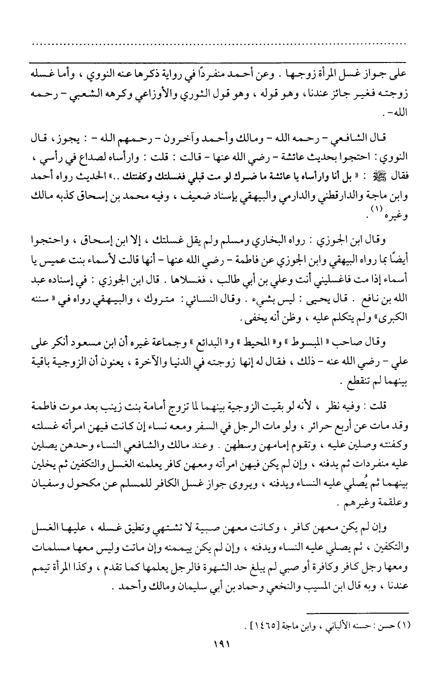 وقال ابن الجوزي: رواه البخاري ومسلم ولم يقل غسلتك، إلا ابن إسحاق، واحتجوا أيضا بما رواه البيهقي وابن الجوزي عن فاطمة - رَضِيَ اللَّهُ عَنْهَا - أنها قالت لأسماء بنت عميس يا أسماء إذا مت فاغسليني أنت وعلي بن أبي طالب، فغسلاها. قال ابن الجوزي: في إسناده عبد الله بن نافع. قال يحيى: ليس بشيء. وقال النسائي: متروك، والبيهقي رواه في " سننه الكبرى " ولم يتكلم عليه، وظن أنه يخفى.