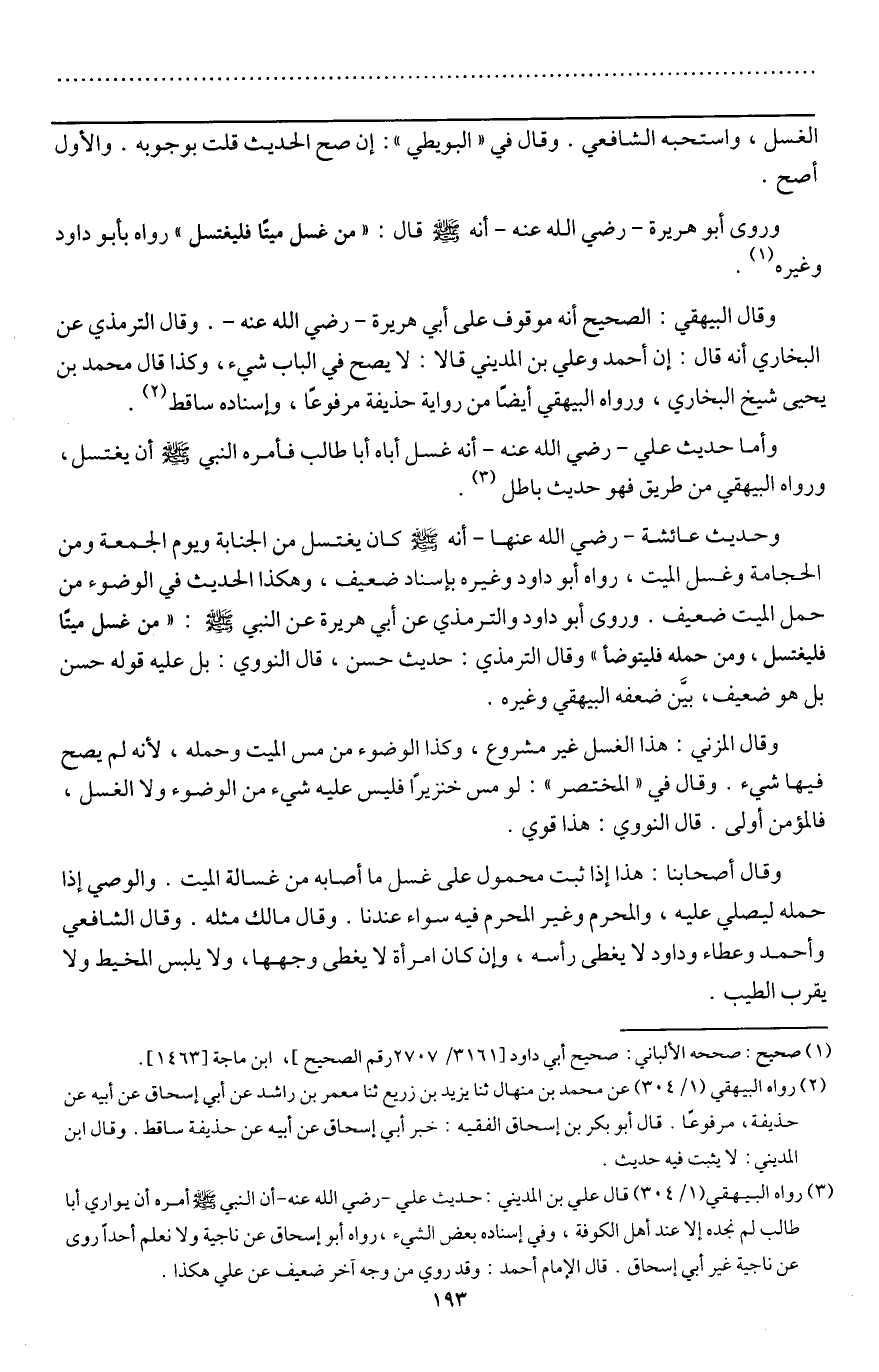 وحديث عائشة - رَضِيَ اللَّهُ عَنْهَا - «أنه - صَلَّى اللَّهُ عَلَيْهِ وَسَلَّمَ - كان يغتسل من الجنابة ويوم الجمعة ومن الحجامة وغسل الميت» رواه أبو داود وغيره بإسناد ضعيف، وهكذا الحديث في الوضوء من حمل الميت ضعيف. وروى أبو داود والترمذي عن أبي هريرة عن النبي - صَلَّى اللَّهُ عَلَيْهِ وَسَلَّمَ -: «من غسل ميتا فليغتسل، ومن حمله فليتوضأ» وقال الترمذي: حديث حسن، قال النووي: بل عليه قوله حسن بل هو ضعيف، بين ضعفه البيهقي وغيره.
