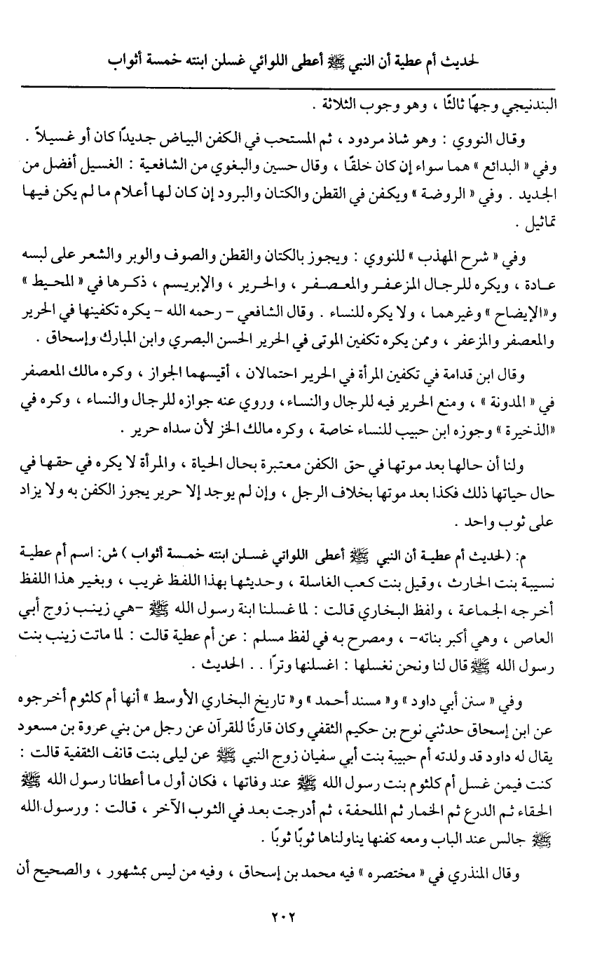 م: (لحديث أم عطية أن «النبي - صَلَّى اللَّهُ عَلَيْهِ وَسَلَّمَ - أعطى اللوائي غسلن ابنته خمسة أثواب» ش: اسم أم عطية نسيبة بنت الحارث، وقيل بنت كعب الغاسلة، وحديثها بهذا اللفظ غريب، وبغير هذا اللفظ أخرجه الجماعة، ولفظ البخاري قالت: «لما غسلنا ابنة رسول الله - صَلَّى اللَّهُ عَلَيْهِ وَسَلَّمَ - هي زينب زوج أبي العاص،» وهي أكبر بناته -، ومصرح به في لفظ مسلم: عن أم عطية قالت: «لما ماتت زينب بنت رسول الله - صَلَّى اللَّهُ عَلَيْهِ وَسَلَّمَ - قال لنا ونحن نغسلها: اغسلنها وترا....» الحديث.