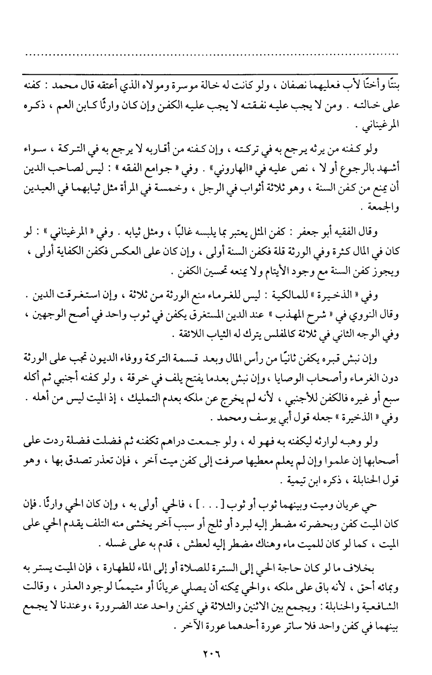 ـــــــــــــــــــــــــــــQبنتا وأختا لأب فعليهما نصفان، ولو كانت له خالة موسرة ومولاه الذي أعتقه قال محمد: كفنه على خالته. ومن لا يجب عليه نفقته لا يجب عليه الكفن وإن كان وارثا كابن العم، ذكره المرغيناني.