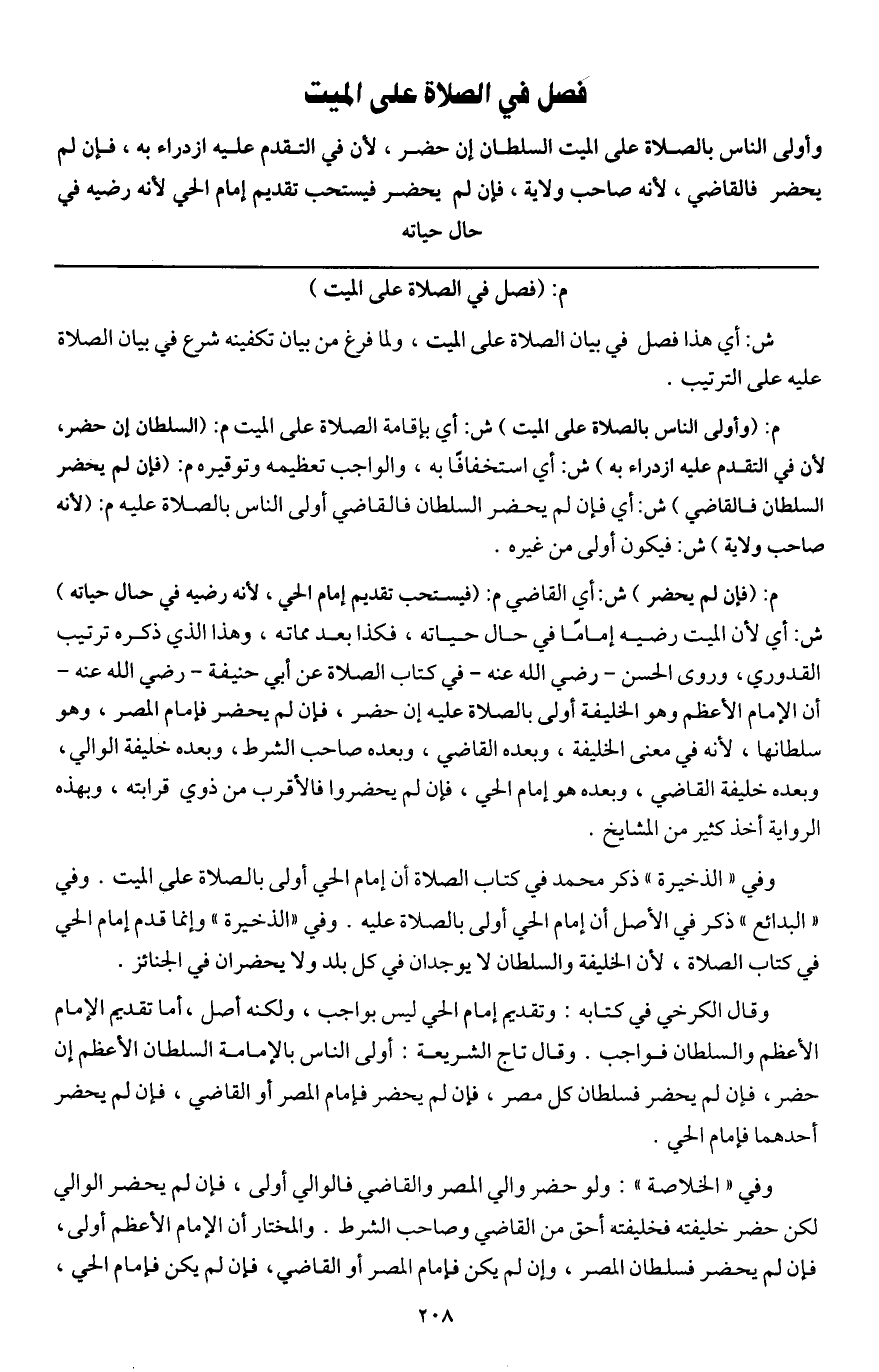 وفي " الذخيرة " ذكر محمد في كتاب الصلاة أن إمام الحي أولى بالصلاة على الميت. وفي " البدائع " ذكر في الأصل أن إمام الحي أولى بالصلاة عليه. وفي " الذخيرة " وإنما قدم إمام الحي في كتاب الصلاة، لأن الخليفة والسلطان لا يوجدان في كل بلد ولا يحضران في الجنائز.