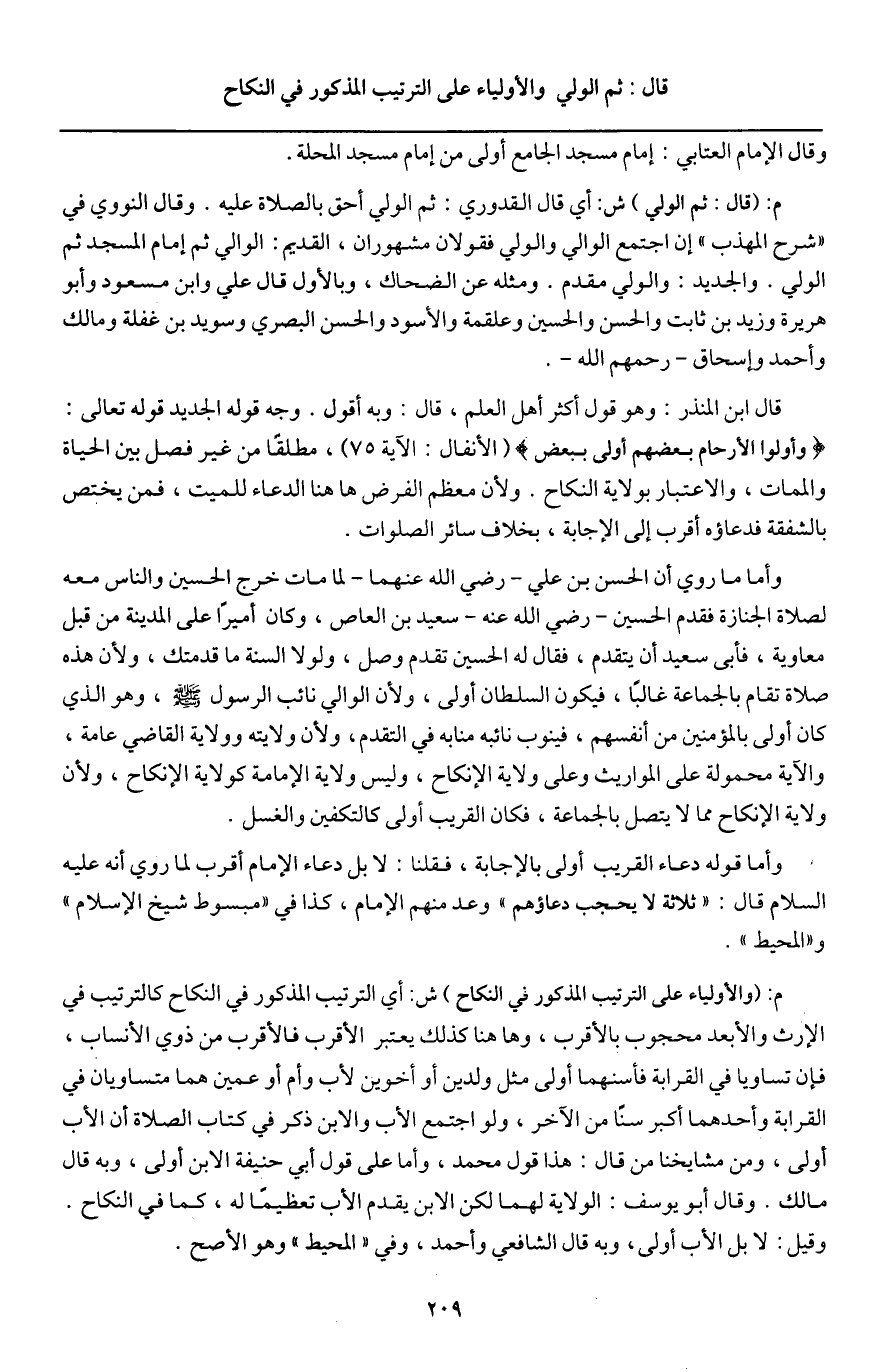 ـــــــــــــــــــــــــــــQوقال الإمام العتابي: إمام مسجد الجامع أولى من إمام مسجد المحلة.