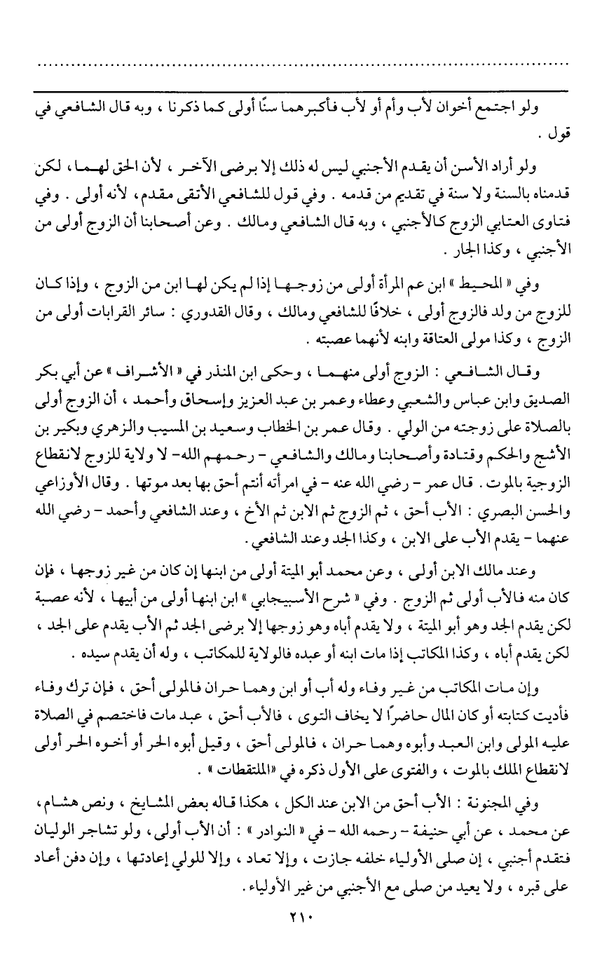 وإن مات المكاتب من غير وفاء وله أب أو ابن وهما حران فالمولى أحق، فإن ترك وفاء فأديت كتابته أو كان المال حاضرا لا يخاف التوى، فالأب أحق، عبد مات فاختصم في الصلاة عليه المولى وابن العبد وأبوه وهما حران، فالمولى أحق، وقيل أبوه الحر أوأخوه الحر أولى لانقطاع الملك بالموت، والفتوى على الأول ذكره في " الملتقطات ".