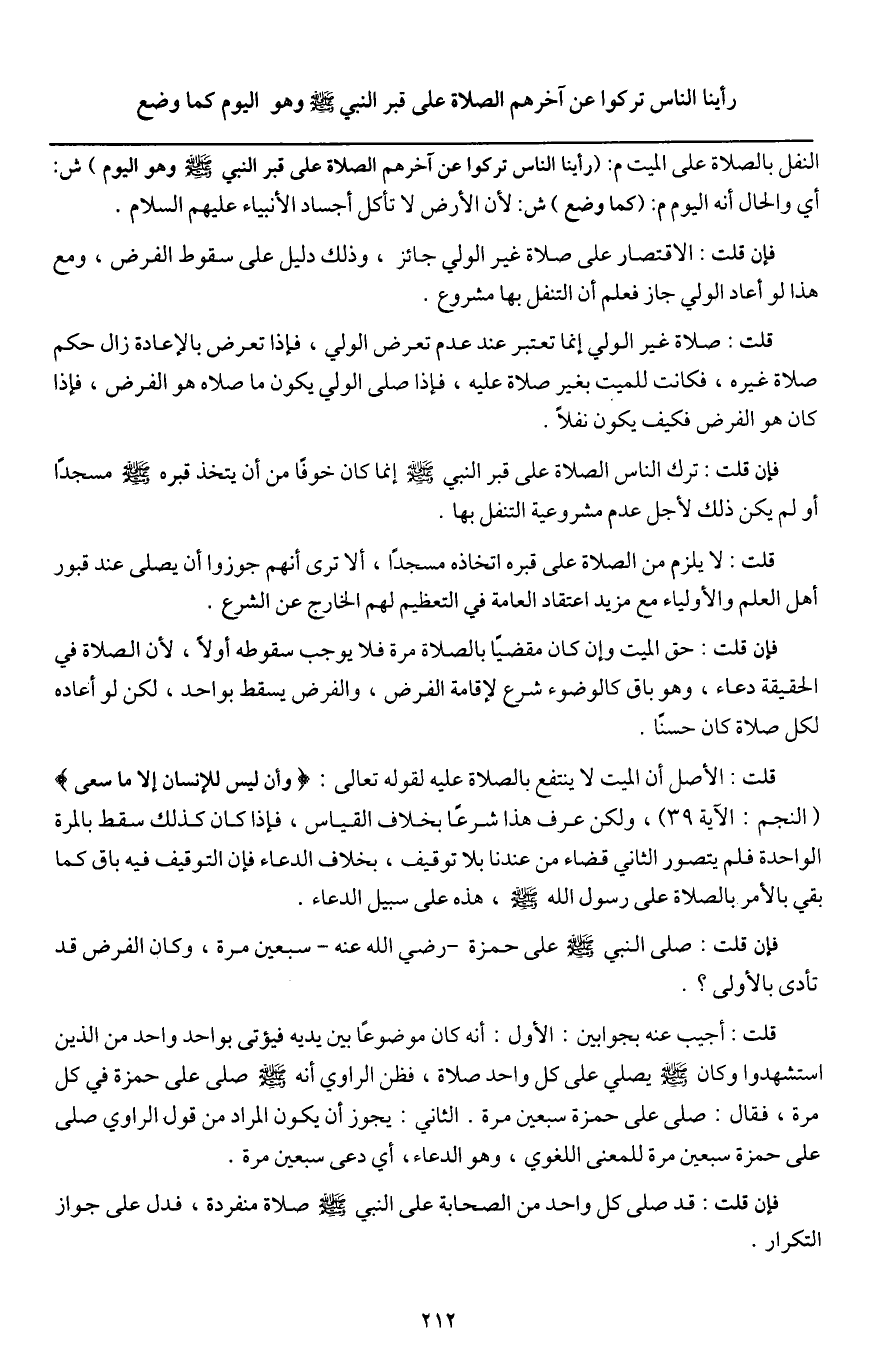 ـــــــــــــــــــــــــــــQالنفل بالصلاة على الميت م: (رأينا الناس تركوا عن آخرهم الصلاة على قبر النبي - صَلَّى اللَّهُ عَلَيْهِ وَسَلَّمَ - وهو اليوم) ش: أي والحال أنه اليوم م: (كما وضع) ش: لأن الأرض لا تأكل أجساد الأنبياء - عَلَيْهِمْ السَّلَامُ -.