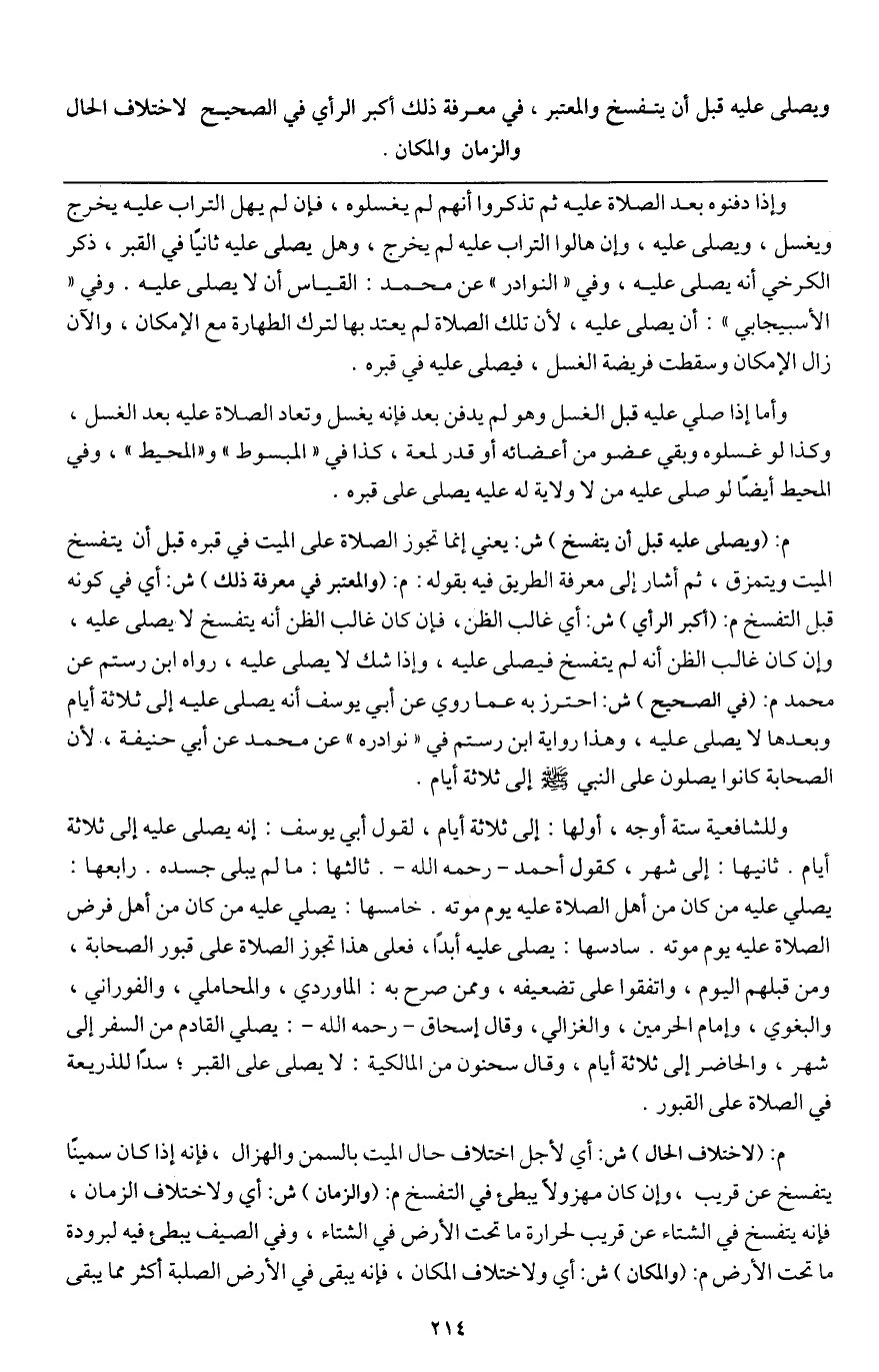 ويصلى عليه قبل أن يتفسخ والمعتبر، في معرفة ذلك أكبر الرأي في الصحيح لاختلاف الحال والزمان والمكان