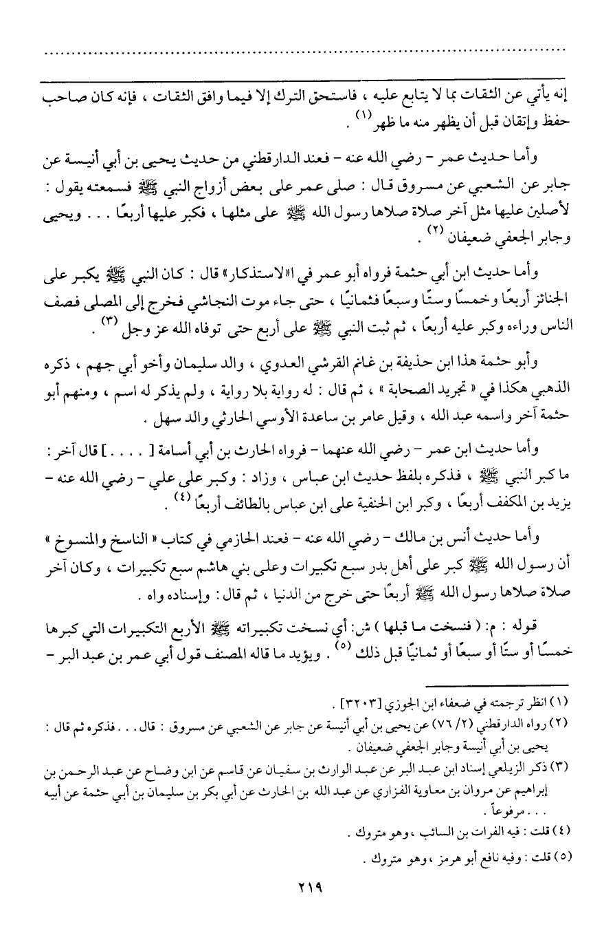 وأما حديث عمر - رَضِيَ اللَّهُ عَنْهُ - فعند الدارقطني من حديث يحيى بن أبي أنيسة عن جابر عن الشعبي عن مسروق قال: «صلى عمر على بعض أزواج النبي - صَلَّى اللَّهُ عَلَيْهِ وَسَلَّمَ - فسمعته يقول: لأصلين عليها مثل آخر صلاة صلاها رسول الله - صَلَّى اللَّهُ عَلَيْهِ وَسَلَّمَ - على مثلها، فكبر عليها أربعا ... » ويحيى وجابر الجعفي ضعيفان.