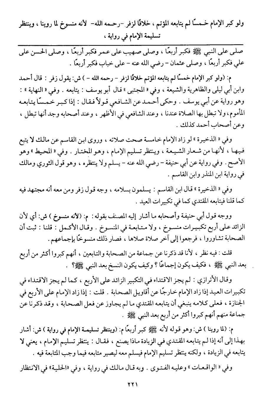 ولو كبر الإمام خمسا لم يتابعه المؤتم، خلافا لزفر - رَحِمَهُ اللَّهُ - لأنه منسوخ لما روينا، وينتظر تسليمة الإمام في رواية،