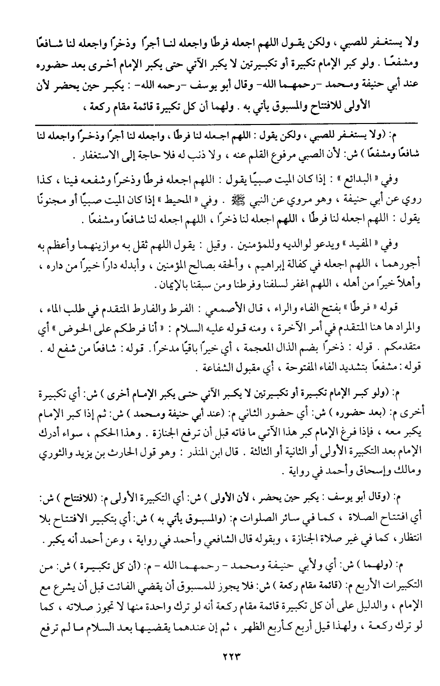 ولا يستغفر للصبي، ولكن يقول اللهم اجعله فرطا واجعله لنا أجرا وذخرا واجعله لنا شافعا ومشفعا. ولو كبر الإمام تكبيرة أو تكبيرتين لا يكبر الآتي حتى يكبر الإمام أخرى بعد حضوره عند أبي حنيفة ومحمد - رحمهما الله - وقال أبو يوسف - رَحِمَهُ اللَّهُ -: يكبر حين يحضر لأن الأولى للافتتاح والمسبوق يأتي به. ولهما أن كل تكبيرة قائمة مقام ركعة،