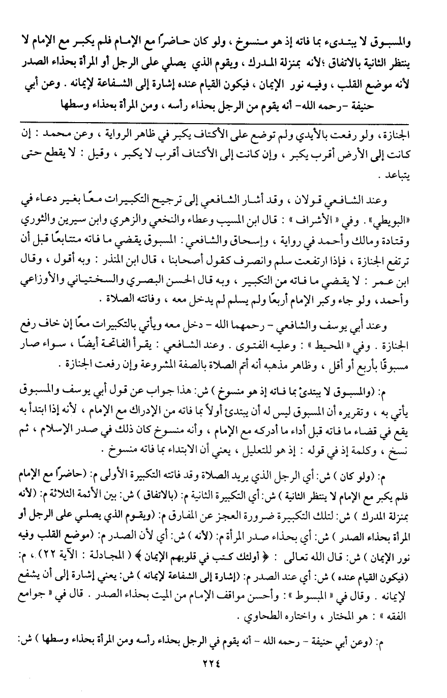 والمسبوق لا يبتدئ بما فاته إذ هو منسوخ، ولو كان حاضرا مع الإمام فلم يكبر مع الإمام لا ينتظر الثانية بالاتفاق؛ لأنه بمنزلة المدرك، ويقوم الذي يصلي على الرجل أو المرأة بحذاء الصدر لأنه موضع القلب، وفيه نور الإيمان، فيكون القيام عنده إشارة إلى الشفاعة لإيمانه. وعن أبي حنيفة - رَحِمَهُ اللَّهُ - أنه يقوم من الرجل بحذاء رأسه، ومن المرأة بحذاء وسطها