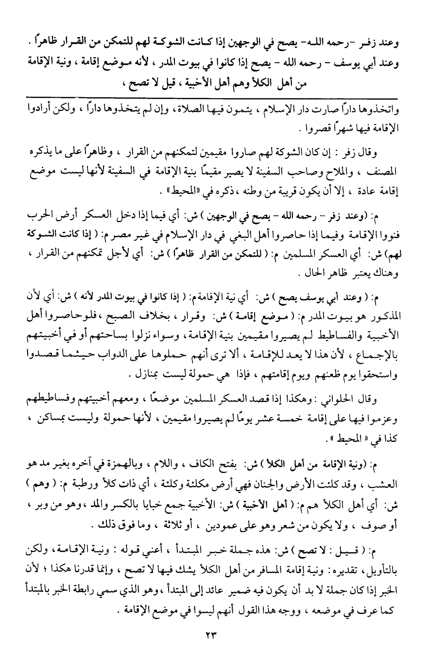 وقال زفر: إن كان الشوكة لهم صاروا مقيمين لتمكنهم من القرار، وظاهرا على ما يذكره المصنف، والملاح وصاحب السفينة لا يصير مقيما بنية الإقامة في السفينة لأنها ليست موضع إقامة عادة، إلا أن يكون قريبة من وطنه، ذكره في "المحيط ".