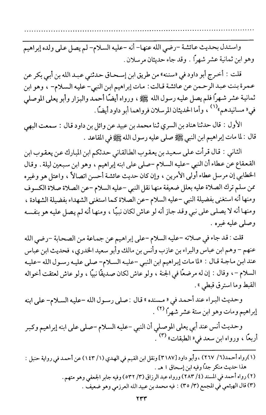 قلت: أخرج أبو داود في " سننه " من طريق ابن إسحاق حدثني عبد الله بن أبي بكر عن عمرة بنت عبد الرحمن عن عائشة قالت: «مات إبراهيم ابن النبي - عَلَيْهِ السَّلَامُ -، وهو ابن ثمانية عشر شهرا فلم يصل عليه رسول الله - صَلَّى اللَّهُ عَلَيْهِ وَسَلَّمَ -» -، ورواه أيضا أحمد والبزار وأبو يعلى الموصلي في " مسانيدهم "، وأما الحديثان المرسلان فرواهما أبو داود أيضا.