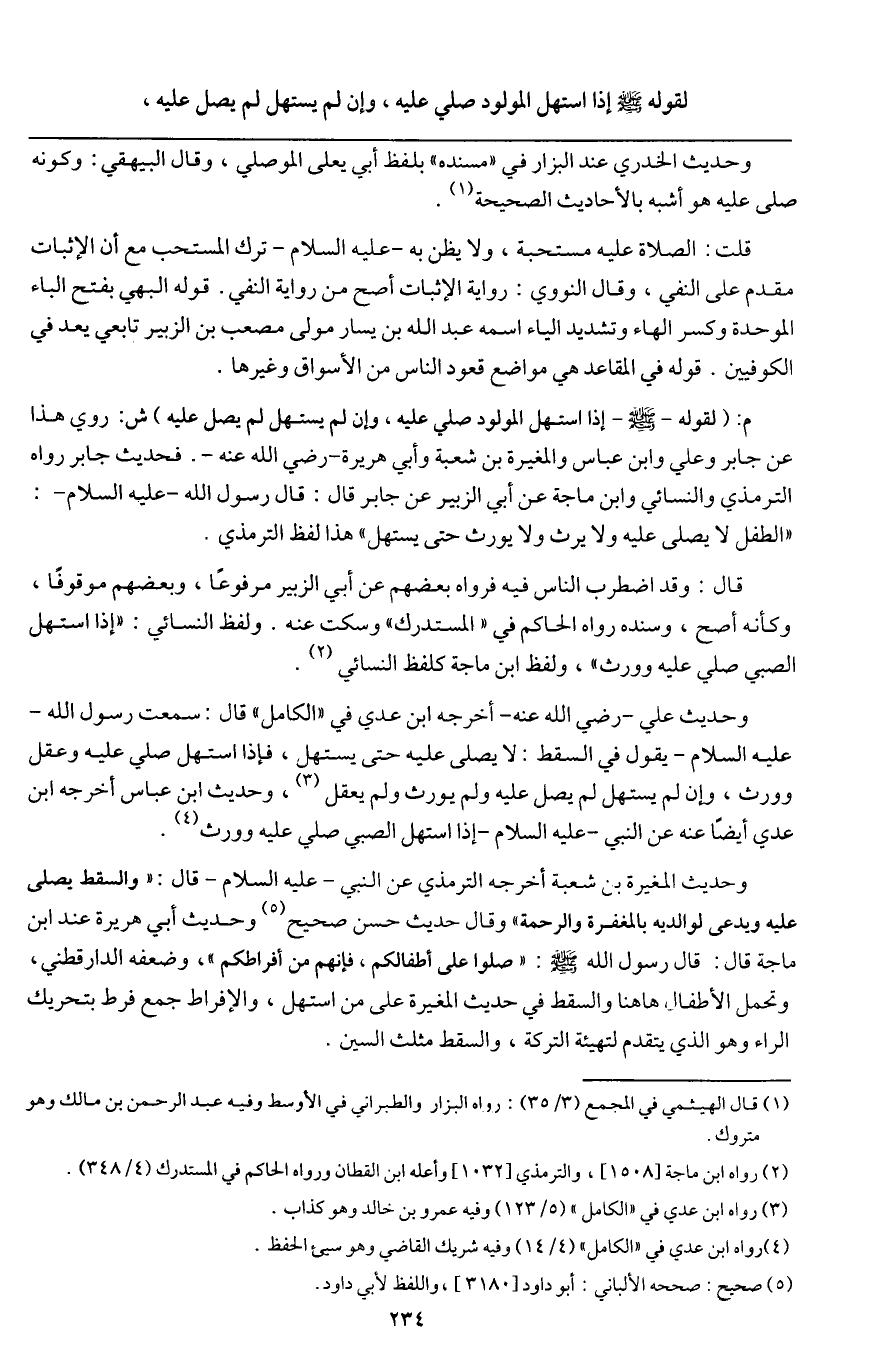 «وحديث علي - رَضِيَ اللَّهُ عَنْهُ - أخرجه ابن عدي في " الكامل " قال: سمعت رسول الله - عَلَيْهِ السَّلَامُ - يقول في السقط: لا يصلى عليه حتى يستهل، فإذا استهل صلي عليه وعقل وورث، وإن لم يستهل لم يصل عليه ولم يورث ولم يعقل» وحديث ابن عباس أخرجه ابن عدي أيضا عنه عن النبي - عَلَيْهِ السَّلَامُ - «إذا استهل الصبي صلي عليه وورث» .