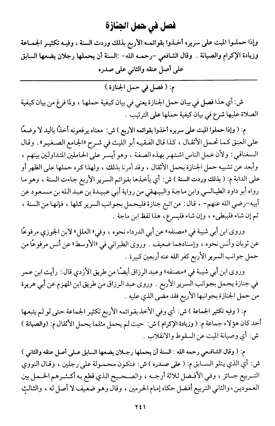 فصل في حمل الجنازة / 50 وإذا حملوا الميت على سريره أخذوا بقوائمه الأربع بذلك وردت السنة، وفيه تكثير الجماعة وزيادة الإكرام والصيانة. وقال الشافعي - رَحِمَهُ اللَّهُ -: السنة أن يحملها رجلان يضعها السابق على أصل عنقه والثاني على صدره