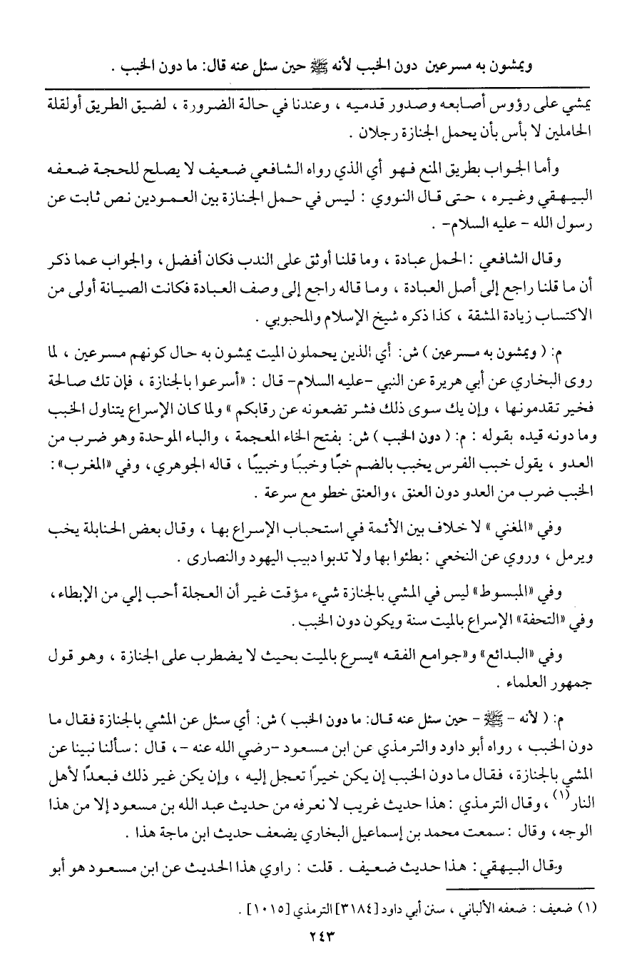 وفي " المغني " لا خلاف بين الأئمة في استحباب الإسراع بها، وقال بعض الحنابلة يخب ويرمل، وروي عن النخعي: بطئوا بها ولا تدبوا دبيب اليهود والنصارى.