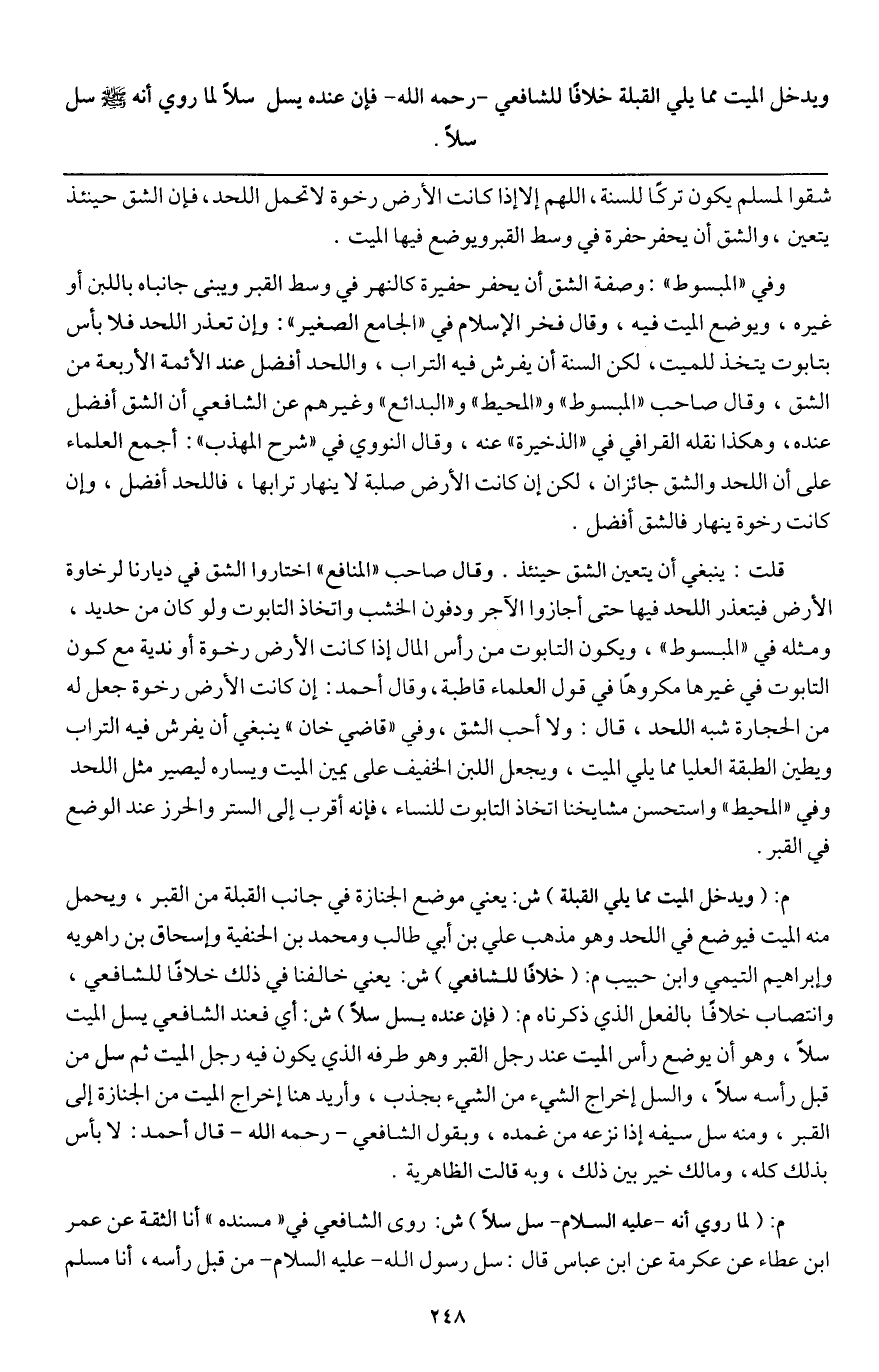 ـــــــــــــــــــــــــــــQشقوا لمسلم يكون تركا للسنة، اللهم إلا إذا كانت الأرض رخوة لا تحمل اللحد، فإن الشق حينئذ يتعين، والشق أن يحفر حفرة في وسط القبر ويوضع فيها الميت.