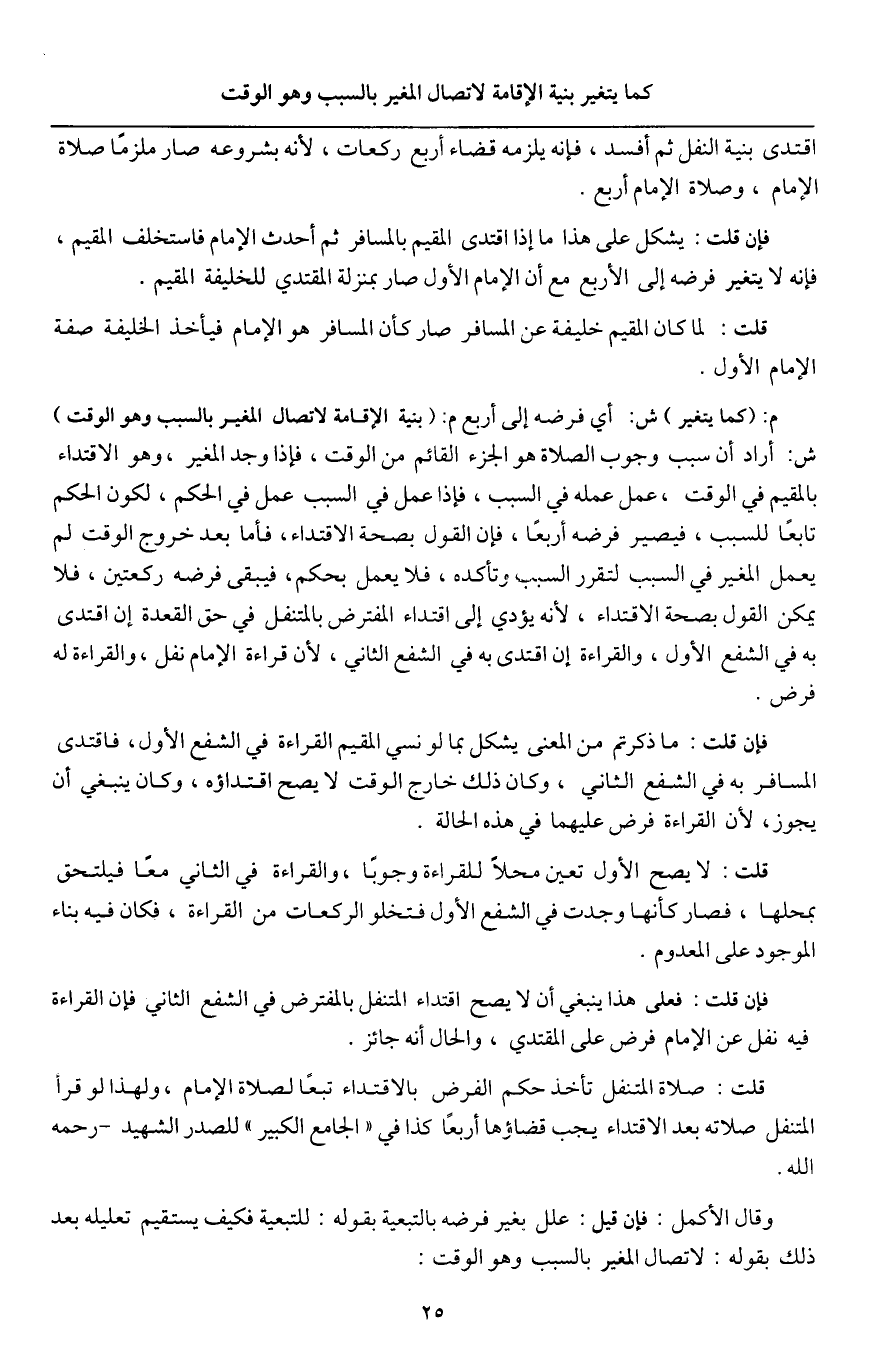 م: (كما يتغير) ش: أي فرضه إلى أربع م: (بنية الإقامة لاتصال المغير بالسبب وهو الوقت) ش: أراد أن سبب وجوب الصلاة هو الجزء القائم من الوقت، فإذا وجد المغير، وهو الاقتداء بالمقيم في الوقت، عمل عمله في السبب، فإذا عمل في السبب عمل في الحكم، لكون الحكم تابعا للسبب، فيصير فرضه أربعا، فإن القول بصحة الاقتداء، فأما بعد خروج الوقت لم يعمل المغير في السبب لتقرر السبب وتأكده، فلا يعمل بحكم، فيبقى فرضه ركعتين، فلا يمكن القول بصحة الاقتداء، لأنه يؤدي إلى اقتداء المفترض بالمتنفل في حق القعدة إن اقتدى به في الشفع الأول، والقراءة إن اقتدى به في الشفع الثاني، لأن قراءة الإمام نفل، والقراءة له فرض.