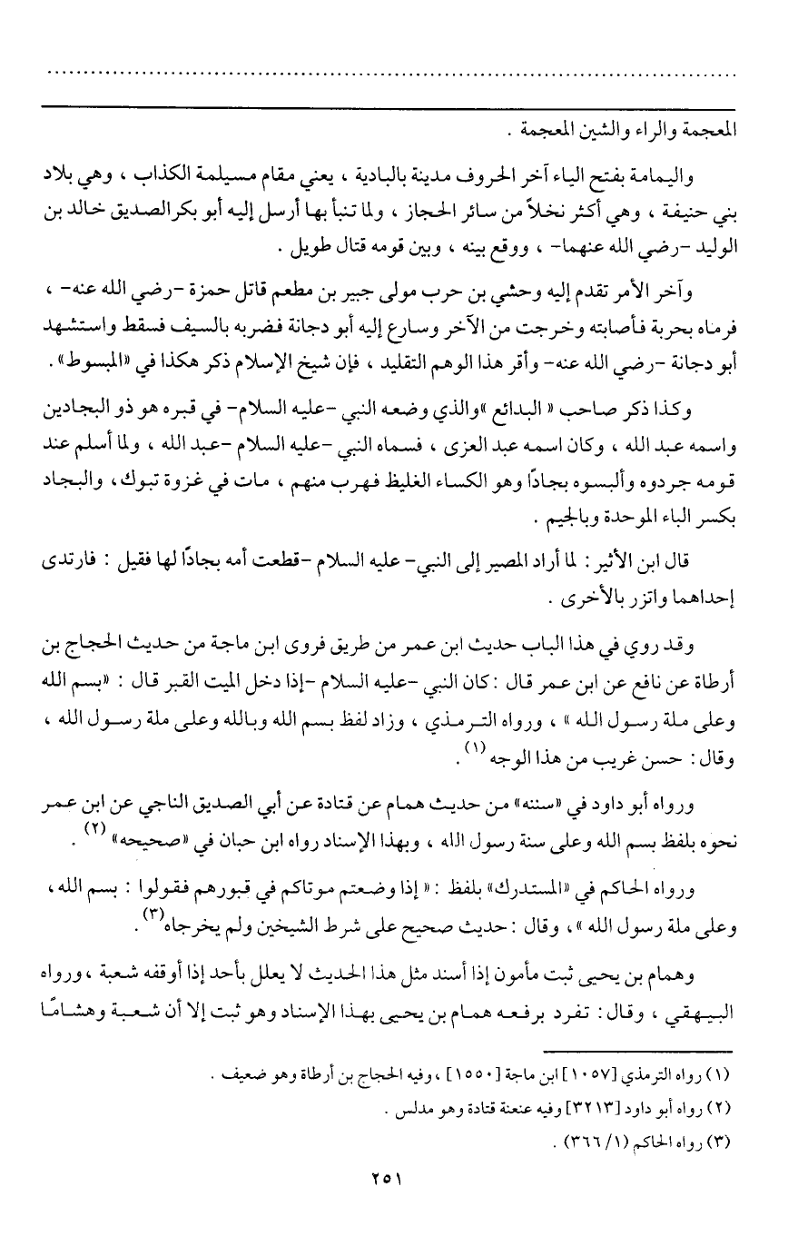 وكذا ذكره صاحب " البدائع " والذي وضعه النبي - عَلَيْهِ السَّلَامُ - في قبره هو ذو البجادين واسمه عبد الله، وكان اسمه عبد العزى، فسماه النبي - عَلَيْهِ السَّلَامُ - عبد الله، ولما أسلم عند قومه جردوه وألبسوه بجادا وهو الكساء الغليظ فهرب منهم، مات في غزوة تبوك، والبجاد بكسر الباء الموحدة وبالجيم.
