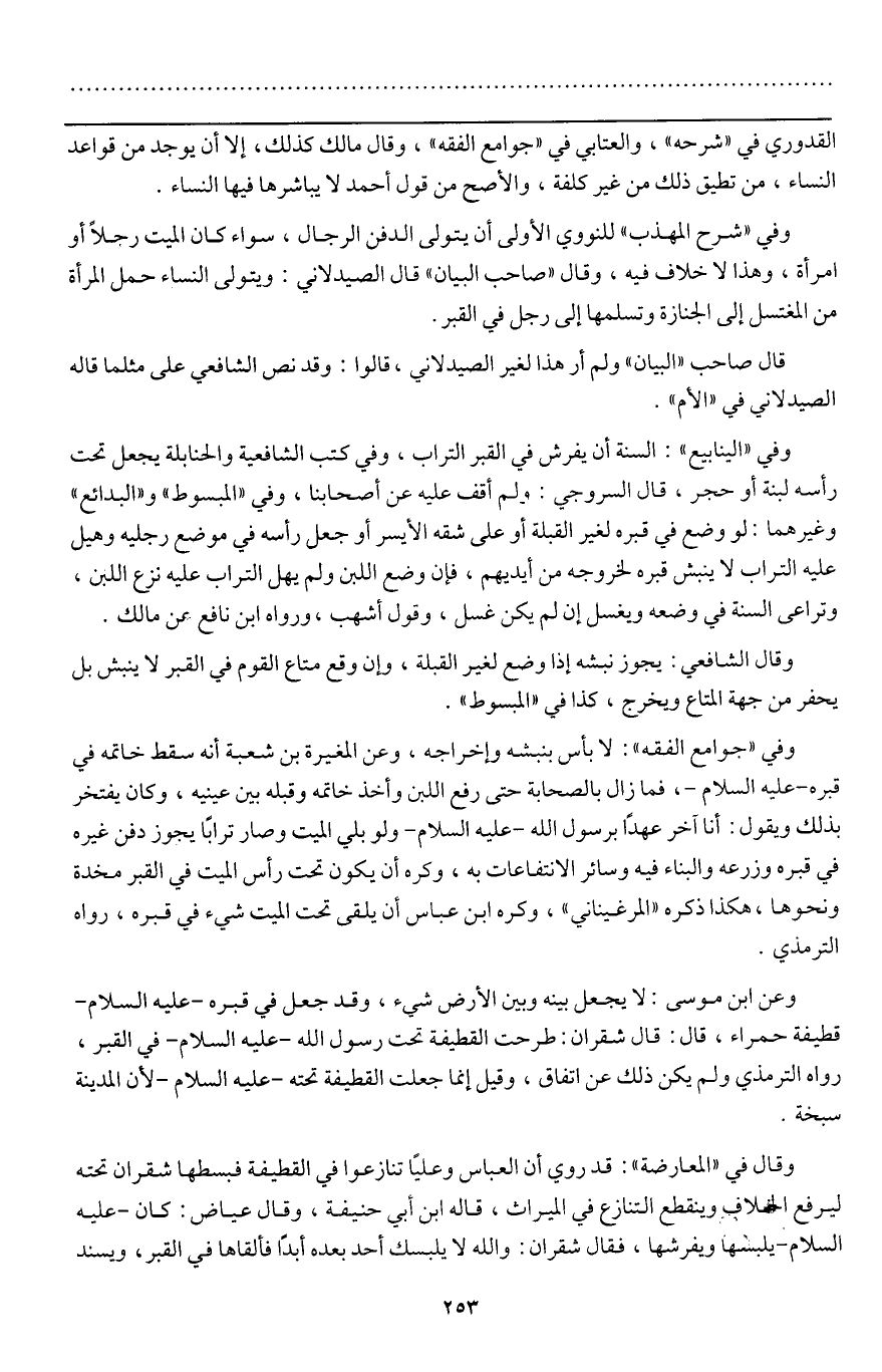 وعن ابن موسى: لا يجعل بينه وبين الأرض شيء، وقد جعل في قبره - عَلَيْهِ السَّلَامُ - قطيفة حمراء، قال: قال شقران: طرحت القطيفة تحت رسول الله - عَلَيْهِ السَّلَامُ - في القبر، رواه الترمذي ولم يكن ذلك عن اتفاق، وقيل إنما جعلت القطيفة تحته - عَلَيْهِ السَّلَامُ - لأن المدينة سبخة.