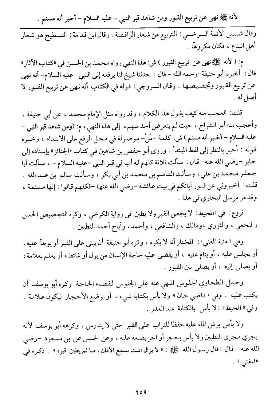 «لأنه - صَلَّى اللَّهُ عَلَيْهِ وَسَلَّمَ - نهى عن تربيع القبور» ومن شاهد قبر النبي - عَلَيْهِ السَّلَامُ - أخبر أنه مسنم..