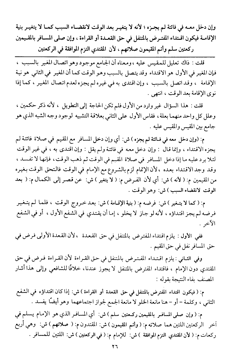 ـــــــــــــــــــــــــــــQقلت: ذلك تعليل للمقيس عليه، ومعناه أن الجامع موجود وهو اتصال المغير بالسبب فإن المغير في الأول هو الاقتداء وقد يتصل بالسبب وهو الوقت كما أن المغير في الثاني هو نية الإقامة، وقد اتصل بالسبب، وإن اقتدى به في غيره لم يجزه لعدم اتصال المغير، كما إذا نوى الإقامة بعد الوقت، انتهى.