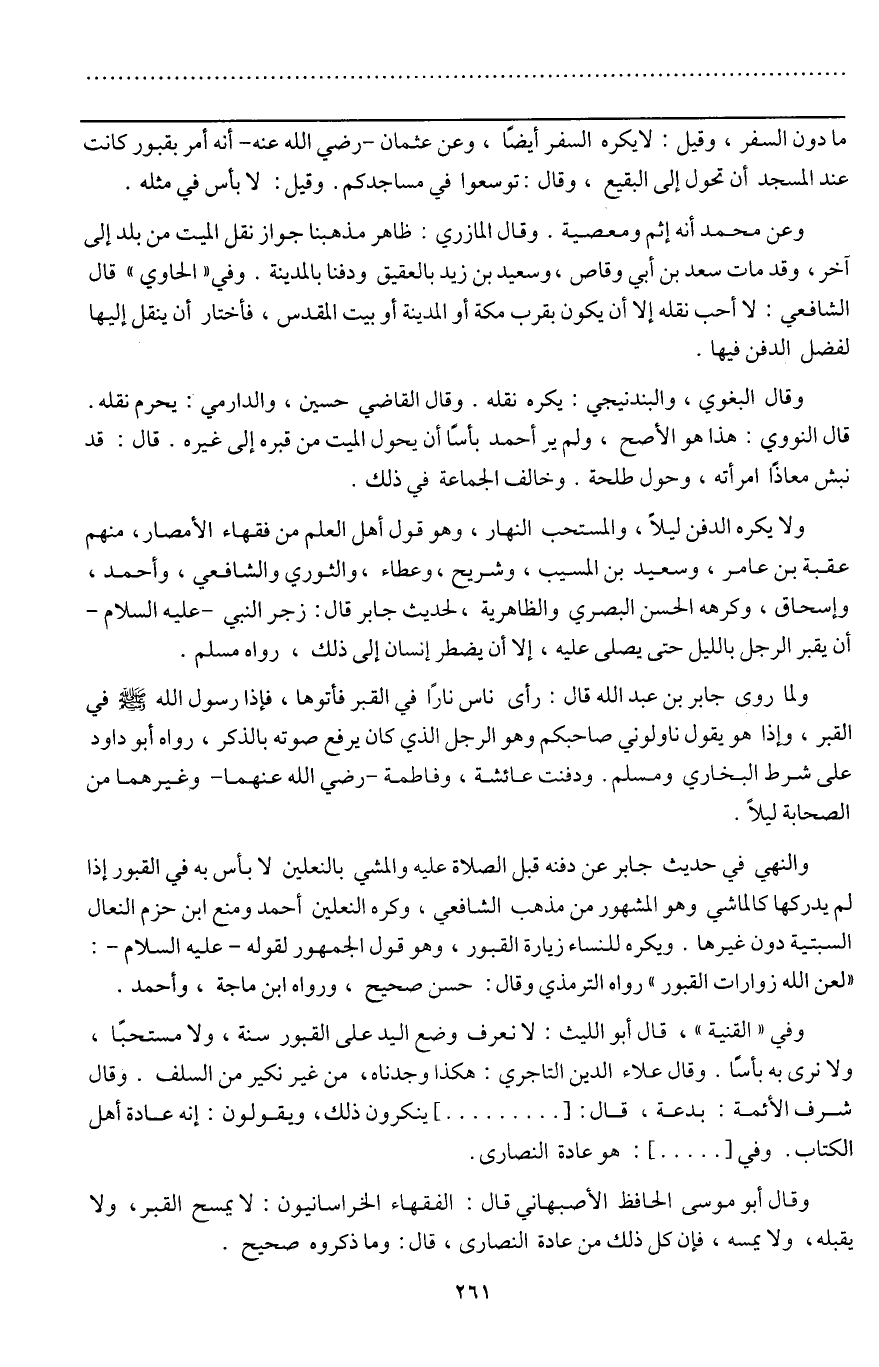 ـــــــــــــــــــــــــــــQما دون السفر، وقيل: لا يكره السفر أيضا، وعن عثمان - رَضِيَ اللَّهُ عَنْهُ - أنه أمر بقبور كانت عند المسجد أن تحول إلى البقيع، وقال: توسعوا في مساجدكم. وقيل: لا بأس في مثله.
