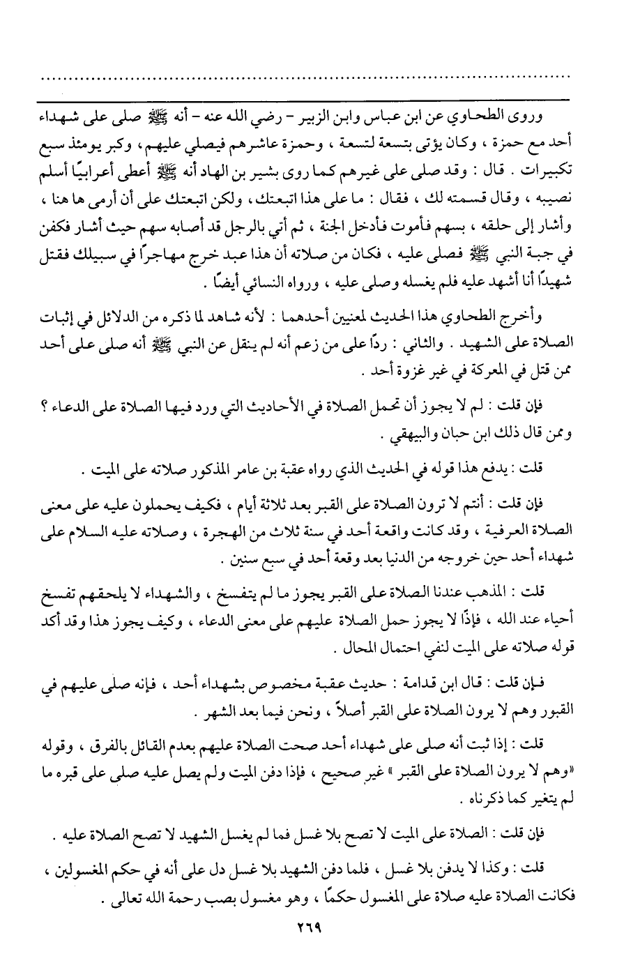 ـــــــــــــــــــــــــــــQوروى الطحاوي عن ابن عباس وابن الزبير - رَضِيَ اللَّهُ عَنْهُ - «أنه - صَلَّى اللَّهُ عَلَيْهِ وَسَلَّمَ - على شهداء أحد مع حمزة، وكان يؤتى بتسعة لتسعة، وحمزة عاشرهم فيصلي عليهم، وكبر يومئذ سبع تكبيرات» . قال: وقد صلى على غيرهم، كما روى بشير بن الهاد «أنه - صَلَّى اللَّهُ عَلَيْهِ وَسَلَّمَ - أعطى أعرابيا أسلم نصيبه، وقال: قسمته لك، فقال: ما على هذا اتبعتك، ولكن ابتعتك على أن أرمى هاهنا - وأشار إلى حلقه - بسهم فأموت فأدخل الجنة، ثم أتي بالرجل قد أصابه سهم حيث أشار فكفن في جبة النبي - صَلَّى اللَّهُ عَلَيْهِ وَسَلَّمَ - فصلى عليه، فكان من صلاته أن هذا عبد خرج مهاجرا في سبيلك فقتل شهيدا، أنا أشهد عليه فلم يغسله وصلى عليه» ورواه النسائي أيضا.