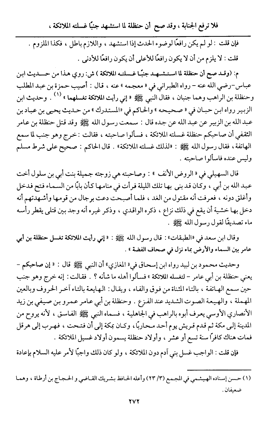 م: (وقد صح أن حنظلة لما استشهد جنبا غسلته الملائكة) ش: روي هذا من حديث ابن عباس - رَضِيَ اللَّهُ عَنْهُ - رواه الطبراني في "معجمه " عنه، قال: أصيب حمزة بن عبد المطلب، وحنظلة بن الراهب وهما جنبان، فقال النبي - صَلَّى اللَّهُ عَلَيْهِ وَسَلَّمَ -: " إني رأيت الملائكة تغسلهما ". وحديث ابن الزبير رواه ابن حبان في "صحيحه " والحاكم في " المستدرك " من حديث يحيى بن عباد بن عبد الله بن الزبير عن عبد الله عن جده قال: «سمعت رسول الله - صَلَّى اللَّهُ عَلَيْهِ وَسَلَّمَ - وقد قتل حنظلة بن عامر الثقفي أن صاحبكم حنظلة غسلته الملائكة، فسألوا صاحبته، فقالت: خرج وهو جنب لما سمع الهاتفة، فقال رسول الله - صَلَّى اللَّهُ عَلَيْهِ وَسَلَّمَ -: " لذلك غسلته الملائكة» . قال الحاكم: صحيح على شرط مسلم وليس عنده فاسألوا صاحبته.