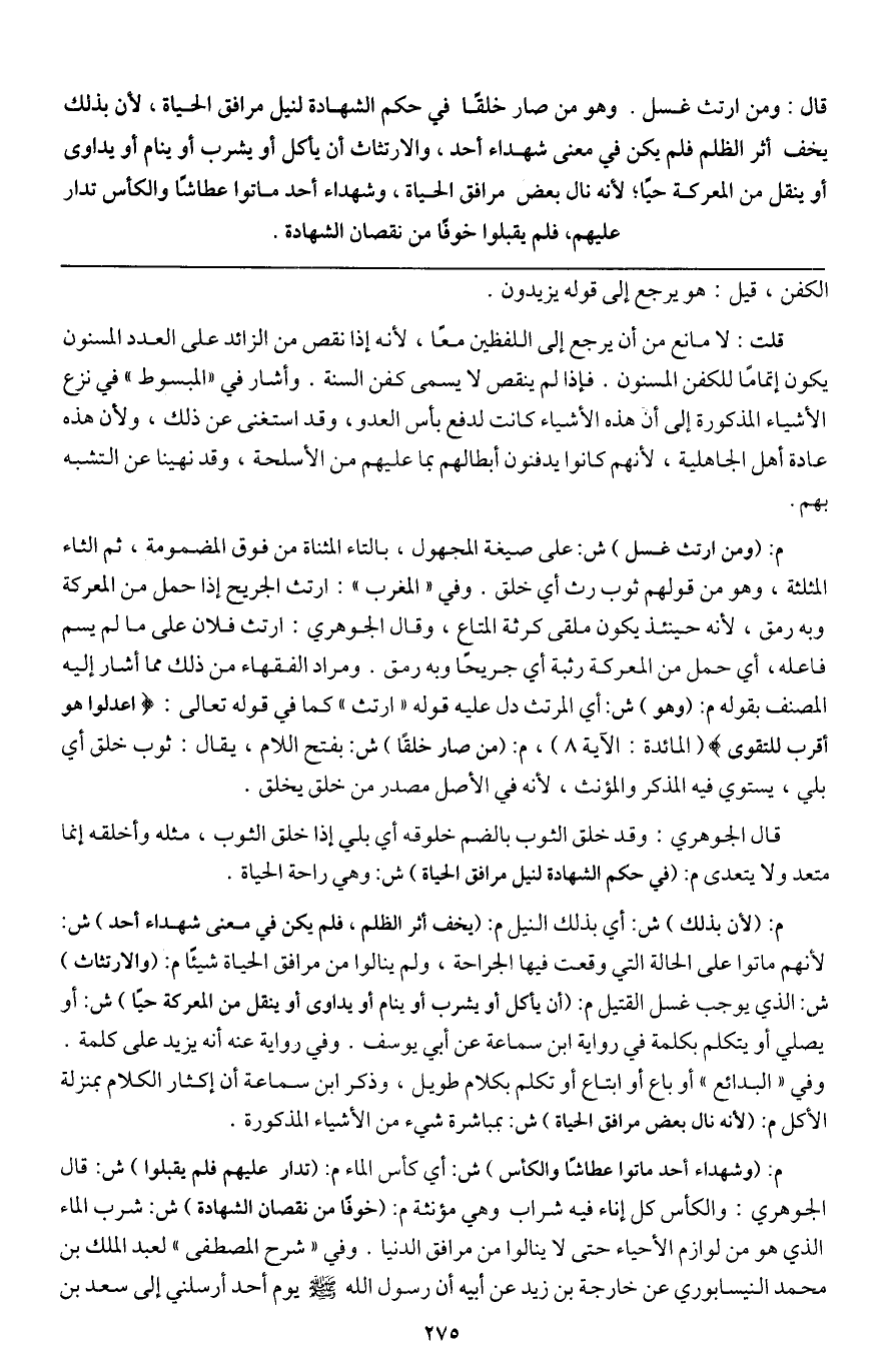 م: (وشهداء أحد ماتوا عطاشا والكأس) ش: أي كأس الماء م: (تدار عليهم فلم يقبلوا) ش: قال الجوهري: والكأس كل إناء فيه شراب وهي مؤنثة م: (خوفا من نقصان الشهادة) ش: شرب الماء الذي هو من لوازم الأحياء حتى لا ينالوا من مرافق الدنيا. وفي " شرح المصطفى " لعبد الملك بن محمد النيسابوري عن خارجة بن زيد عن أبيه «أن رسول الله - صَلَّى اللَّهُ عَلَيْهِ وَسَلَّمَ - يوم أحد أرسلني إلى سعد بن