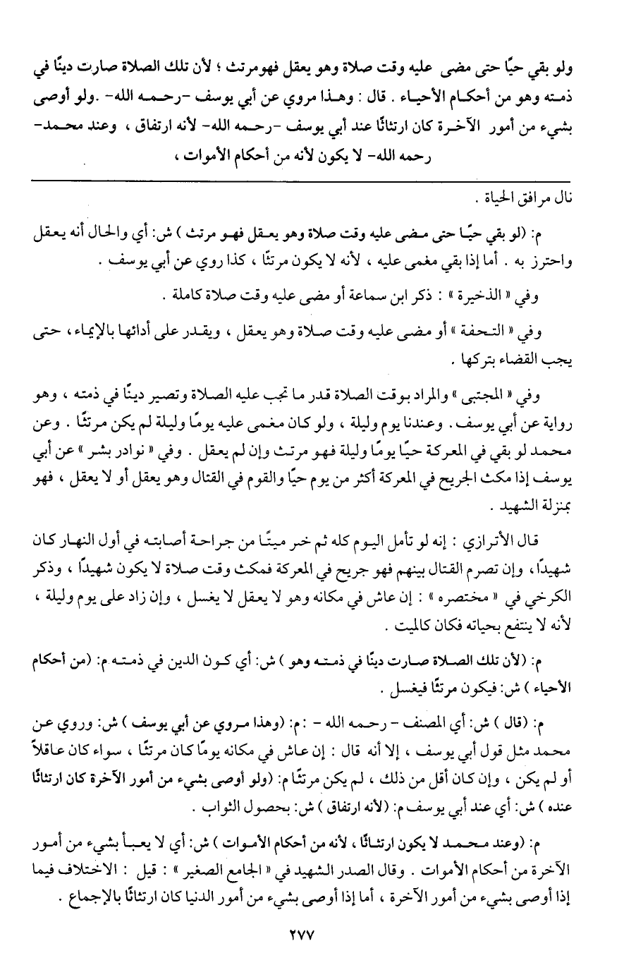 ولو بقي حيا حتى مضى عليه وقت صلاة وهو يعقل فهو مرتث؛ لأن تلك الصلاة صارت دينا في ذمته وهو من أحكام الأحياء، قال: وهذا مروي عن أبي يوسف - رَحِمَهُ اللَّهُ - ولو أوصى بشيء من أمور الآخرة كان ارتثاثا عند أبي يوسف - رَحِمَهُ اللَّهُ - لأنه ارتفاق، وعند محمد - رَحِمَهُ اللَّهُ - لا يكون؛ لأنه من أحكام الأموات