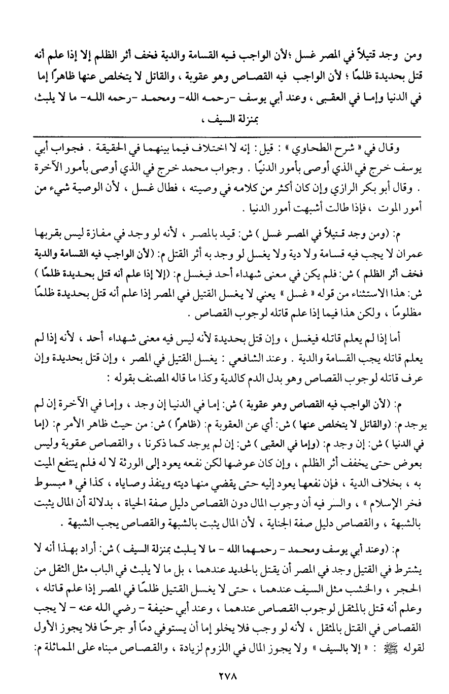ومن وجد قتيلا في المصر غسل؛ لأن الواجب فيه القسامة والدية فخف أثر الظلم إلا إذا علم أنه قتل بحديدة ظلما؛ لأن الواجب فيه القصاص وهو عقوبة، والقاتل لا يتخلص عنها ظاهرا إما في الدنيا وإما في العقبى، وعند أبي يوسف - رَحِمَهُ اللَّهُ - ومحمد - رَحِمَهُ اللَّهُ - ما لا يلبث بمنزلة السيف